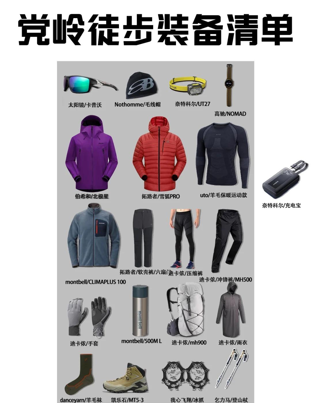 川西党岭徒步最后一周|高海拔徒步装备清单 川西党岭彩林应该只剩一周时间就落叶🍂了,还没去的小伙伴,要赶紧了。下雪❄️霜冻很快就🍁落叶。每年这个时间都是长穿毕,党岭最热闹的时间,今年长穿毕不能走,大家都去了党岭,路上轻装重装的小伙伴都很多。除了看风景大家装备也得带齐、高海拔徒步天气多变。 🥾这次徒步川西带的装备 徒步鞋:凯乐石/MT5-3 冲锋衣:伯希和/北极星 羽绒服:拓路者/雪狐PRO 打底层:uto/羊毛保暖运动款 羊毛袜:danceyarn/3061 太阳镜/卡普沃 Nothomme/毛线帽 头灯:奈特科尔/UT27 手表:高驰/NOMAD 抓绒:montbell/CLIMAPLUS 100 拓路者/软壳裤/六扇门pro 迪卡侬/压缩裤 迪卡侬/冲锋裤/MH500 迪卡依/手套 保温杯:montbell/500M L 背包:迪卡依/mh900 迪卡侬/雨衣 我心飞翔/冰抓 乞力马/登山杖 充电宝:安克20000毫安 徒步丈量世界 户外 徒步 户外徒步 徒步鞋 徒步鞋推荐 徒步包 党岭 党岭徒步 川西党岭 川西徒步 高海拔徒步装备 葫芦海