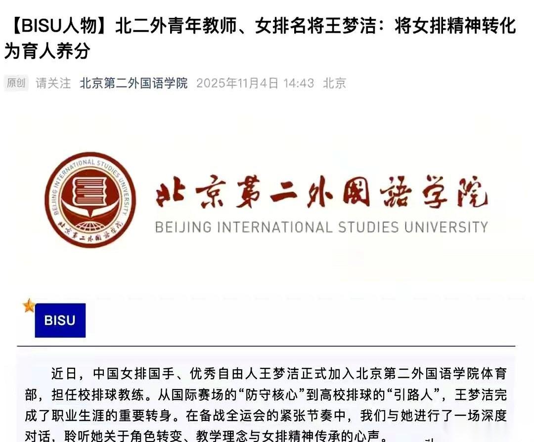刷手机猛地看到,王梦洁去大学当排球教练了。 北京第二外国语学院。 那一瞬间,心里咯噔一下,有点恍惚。 去年10月才结的婚,现在又有了新身份,这是……准备“上岸”了? 也对。运动员的职业生涯,有几个四年?满打满算,也就两三届奥运会的高光时刻,然后呢?然后就是我们这些普通人正在经历的,结婚,工作,过日子。 掰着手指头数了数,巴黎奥运那批姑娘,现在还在国家队的就剩李盈莹、龚翔宇、王媛媛她们几个了。 下一个洛杉矶,谁又能坚持到最后? 这问题问出来,自己都觉得有点残忍。 我们总念叨着“女排精神”,总希望她们永远年轻,永远在场上拼杀,但忘了她们也是一个个活生生的人啊。 会累,会疼,会被伤病拖垮,也需要一个安稳的家,一份踏实的工作。 看着她们一个个从赛场上飞天遁地的女孩,慢慢找到人生的下一站,挺好的。真的。 青春的赛场上哪有什么常青树。 只有一代代用热血和伤病浇灌过的,滚烫的回忆。