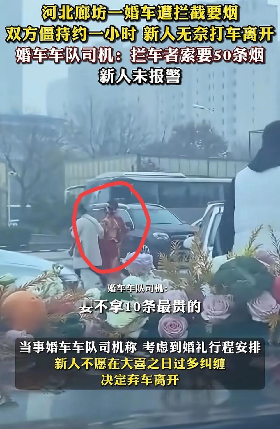 河北廊坊,新人大喜的日子遭拦车要烟,双方僵持近一个小时,新郎新娘无奈之下只能打车