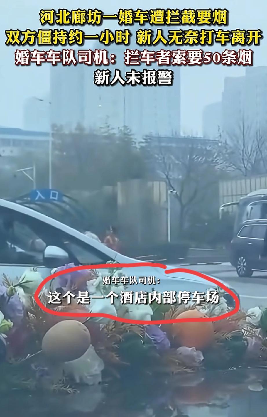 河北廊坊,新人大喜的日子遭拦车要烟,双方僵持近一个小时,新郎新娘无奈之下只能打车走了…… 据婚车司机透露:拦车的要50条烟,要么最贵的那种烟10条。事发地在酒店的内部停车场,新人没有报警,人家不愿意报警…… 小编有一个疑问:既然是酒店的内部停车场,酒店方难道不出面干预吗?或者说这个拦婚车的行为就是酒店方默许的?我特别想知道这是怎么一家酒店,以后谁还敢到这家酒店办酒席?这对新人也是太好说话,就这么自己打车走了! 评论区的诸位大神,你们怎么看?