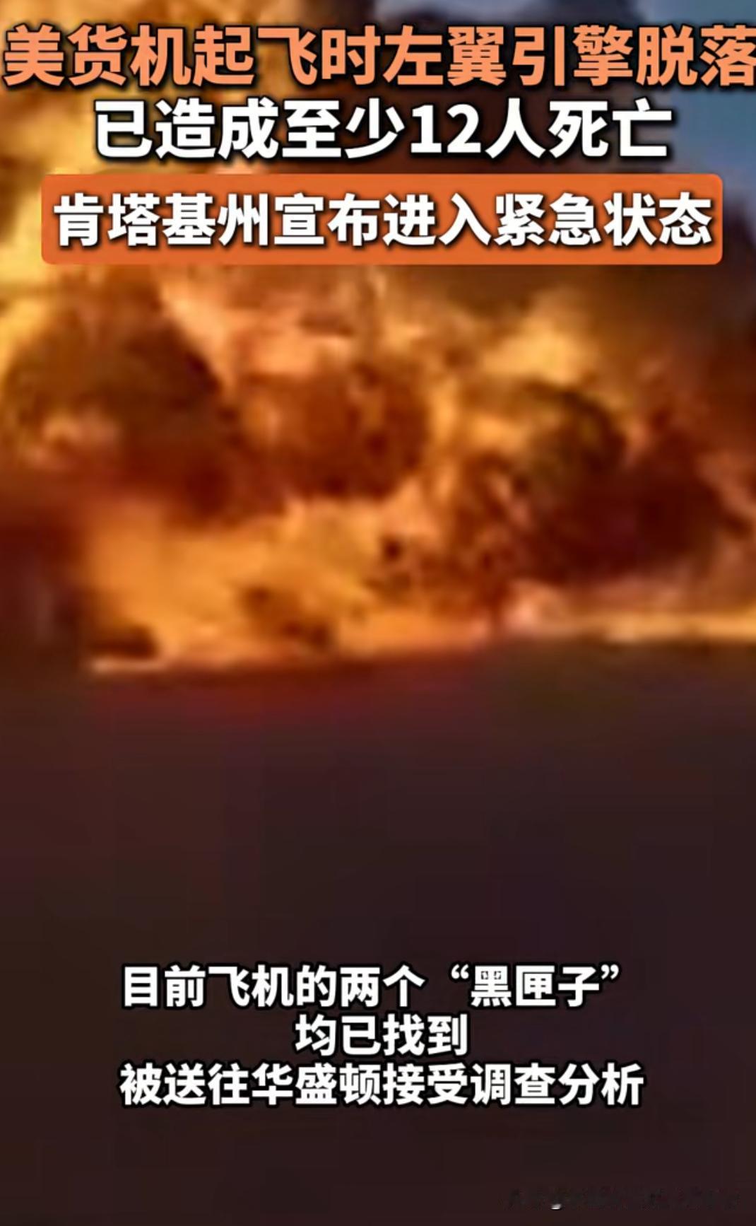 当地时间11月5日,美国肯塔基州路易斯维尔出大事了!一架美国联合包裹运送服务公司(UPS)的货机起飞时,左翼发动机“非包容性失效”,直接从机翼脱落,随后左翼起火,飞机坠毁。 目前死亡人数已上升至12人,包括3名机组成员和9名未确认身份的人员,其中还有一名疑似儿童。16个家庭报告亲属失踪,不过州长表示找到幸存者的可能性不大。州政府已宣布进入紧急状态来协助救援。 坠毁货机的两个“黑匣子”已被找到并送往华盛顿分析。机场虽已重新开放,但因之前航班延误积压,且只有一条跑道可用,航班运行仍受影响。这事故真是太惨烈了!