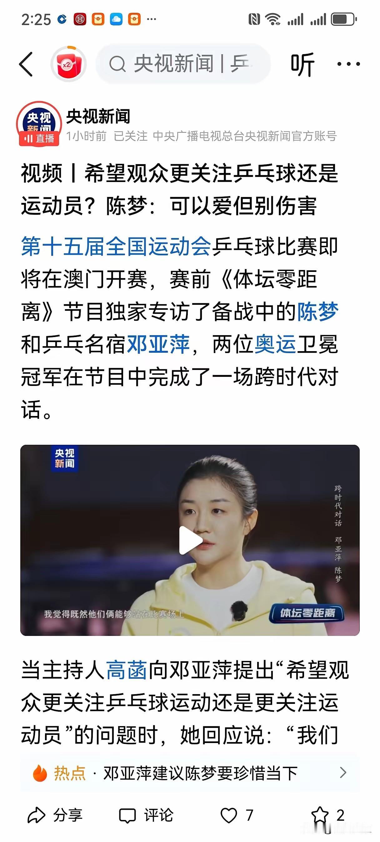 央视新闻连发联陈梦采访释放什么信号? 大家都知道, 巴黎奥运会决赛, 陈梦和孙颖莎那场比赛, 陈梦遭遇了什么? 当然莎莎没有任何错, 但是现场球迷却不理智。 今年全运会, 乒协发文文明观赛条例, 严禁侮辱,谩骂运动员, 估计这次全运会要严格执行了!