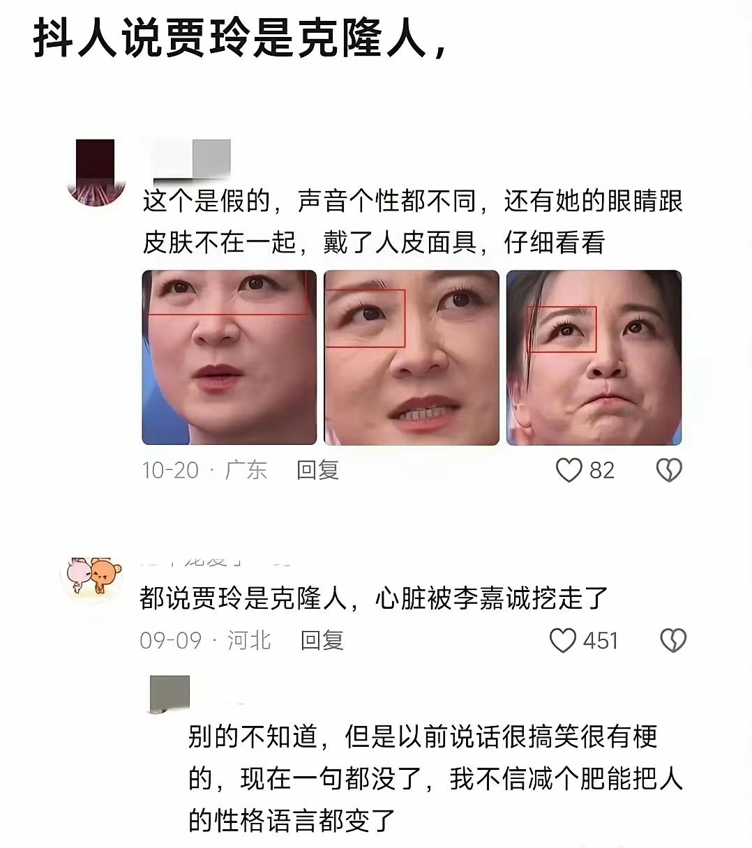 大家千万别人云亦云,被人带偏了,咱这科技还没发展到这种程度吧,说贾玲是克隆人,刘亦菲、胡哥…很多明星都是,还有对比图为证,我都无语了,化妆整容又不是什么新鲜词,有人化了妆连亲妈都认不出来,大S当年那么黑,后来白的发光,说明什么,只要对自己够狠,想变什么样变什么样。