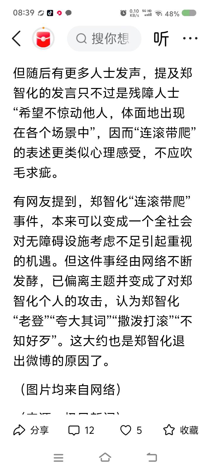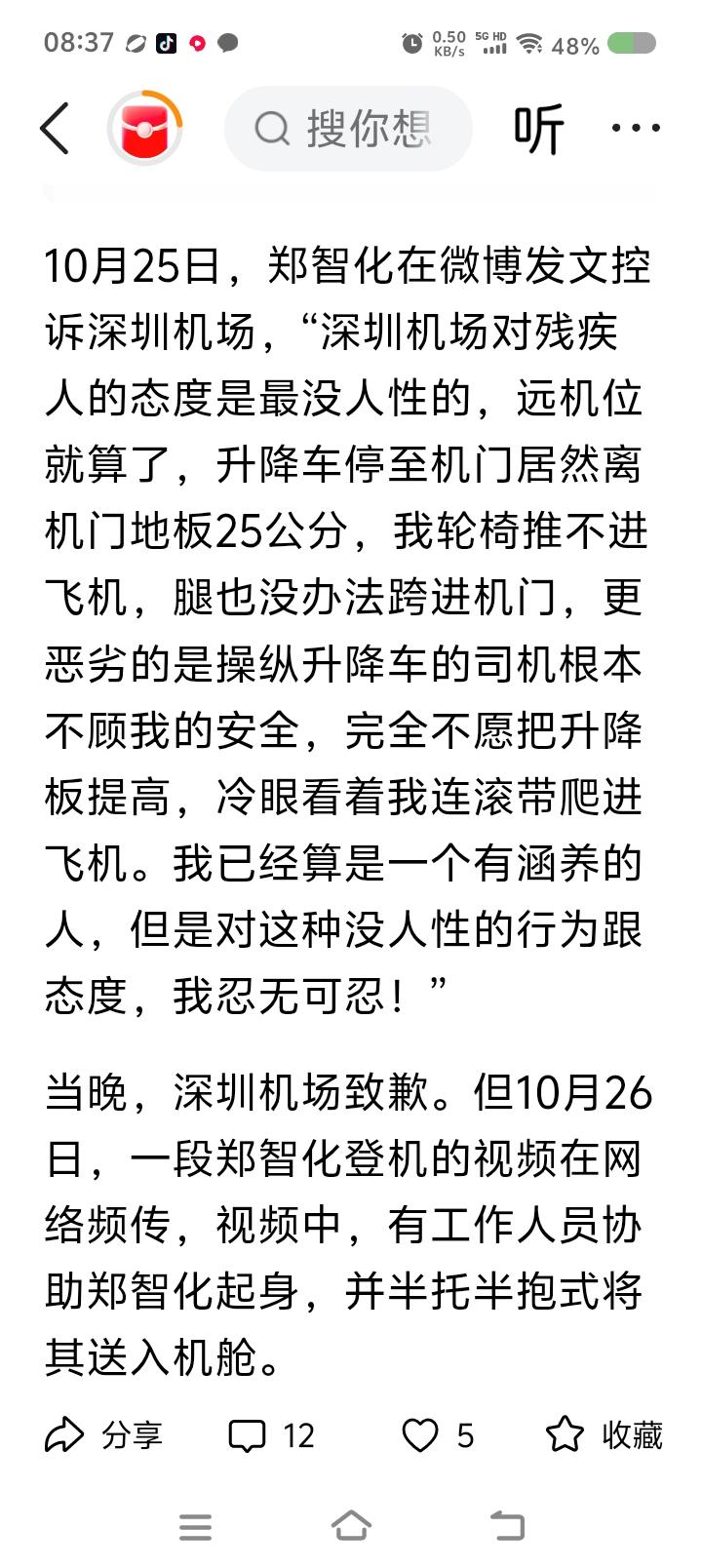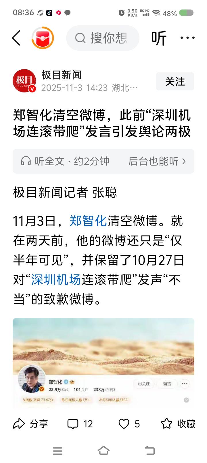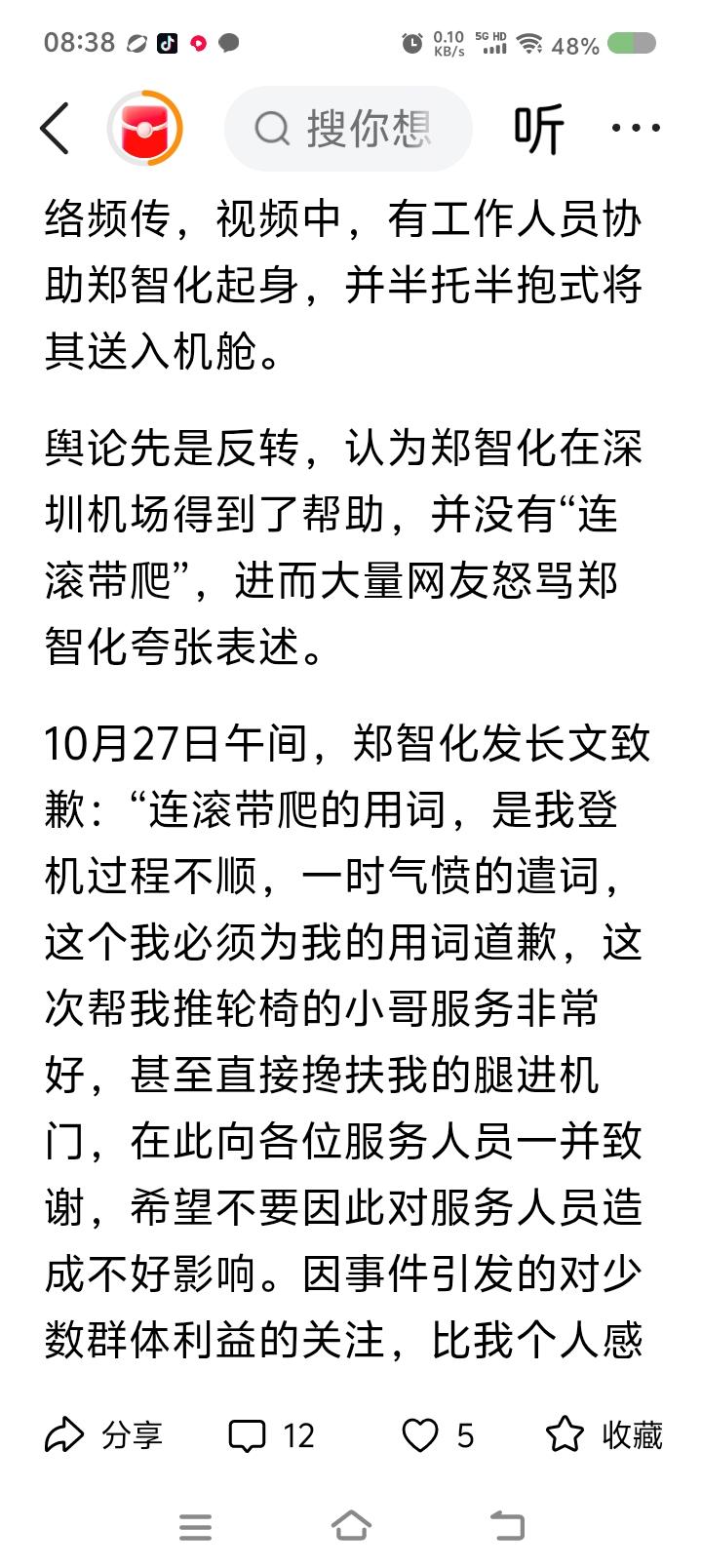 郑智化机场事件,结束了吗?—— 据报道,近日,郑智化发文,批评某机场服务不到位。机场致歉。之后,有视频传出。郑智化发文致歉,称用词不当。舆论反转,网友开始批评郑。郑智化清空某平台消息。 点评: 一、机场未调查清楚前不应道歉。 二、机场应发表调查报告,予以公布。 三、有关方面应实事求是,不要大事化小小事化了。
