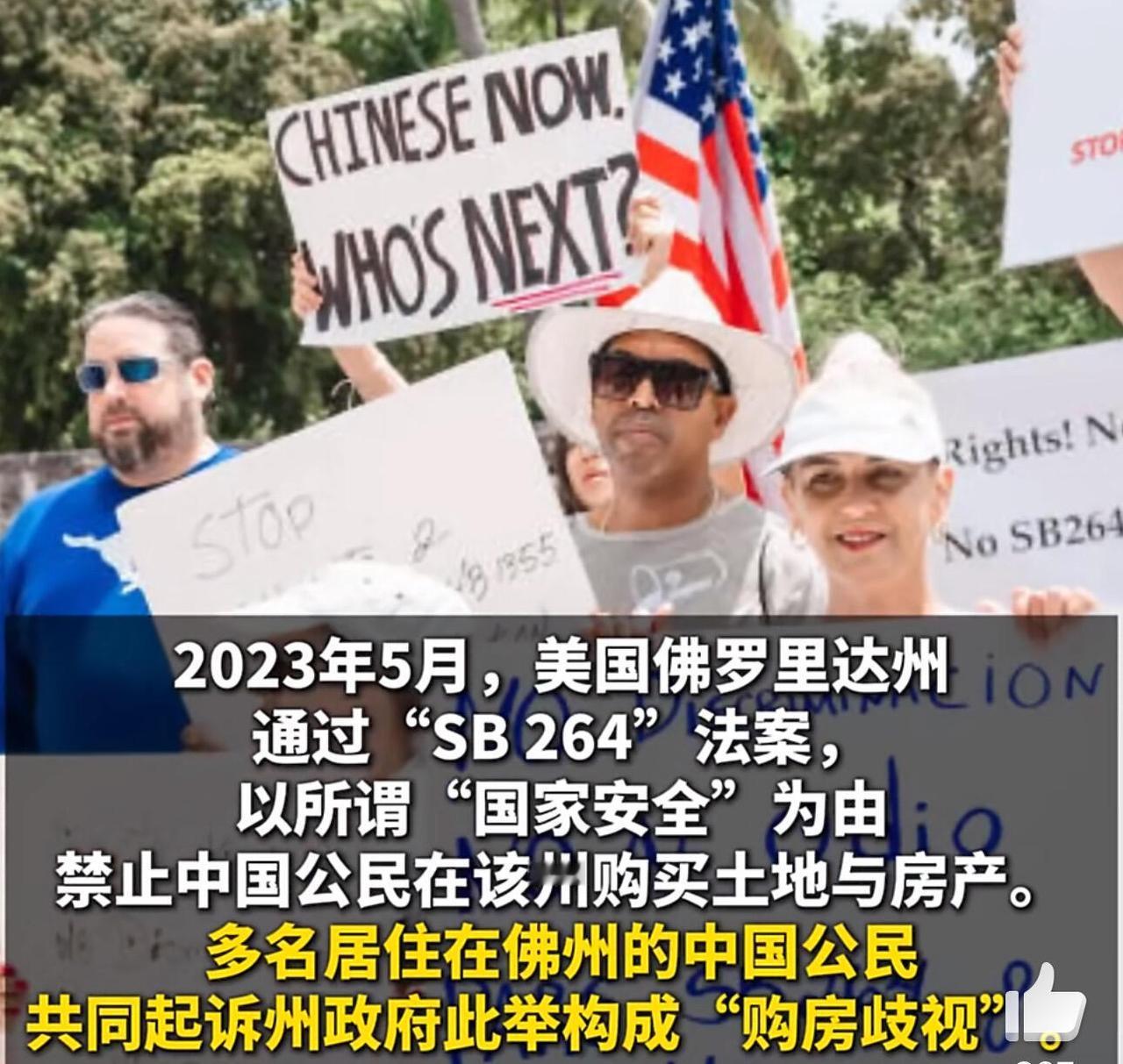 这事儿真是越琢磨越离谱。佛州去年搞了个所谓"防止外国势力侵蚀"的法律,直接禁止包括中国在内的"特定国家"公民买房。消息一出,当地华人圈直接炸锅。 我认识个在迈阿密开了二十年中餐馆的老陈,孩子都在美国出生,现在想换套学区房却被卡住了。他苦笑着说:"我在这儿依法纳税二十年,突然就成了安全隐患?"更荒诞的是,这法律连持有美国绿卡的华人都限制,等于把很多早已扎根美国的华人家庭一脚踢出了"信任圈"。 最夸张的是还有追溯条款——连已经买的房产都可能被强制登记甚至剥离。有个在奥兰多投资了度假公寓的上海阿姨急得不行:"当年合法买的房,现在说变就变?"这种掀旧账的操作,连美国本地的房产协会都看不下去了,直呼违背私有财产保护原则。 双标玩得也挺明显。同一部法律对拉美国家的投资者就网开一面。难怪有美国网友自嘲:"原来安全的定义,取决于钞票的颜色。" 说白了,这就是一群政客在炒作"中国威胁论"。把普通华人买房说成什么"军事渗透",简直可笑。数据显示中国买家在佛州房产交易中占比还不到2%,哪来的什么"渗透威胁"? 真正受害的是谁?是靠着房产交易吃饭的本地中介、装修工人、律师,是那些因为华人投资而焕发活力的社区。政治作秀最终伤到的,还是老百姓自己。