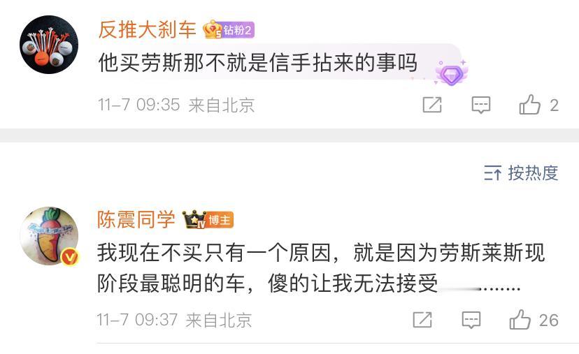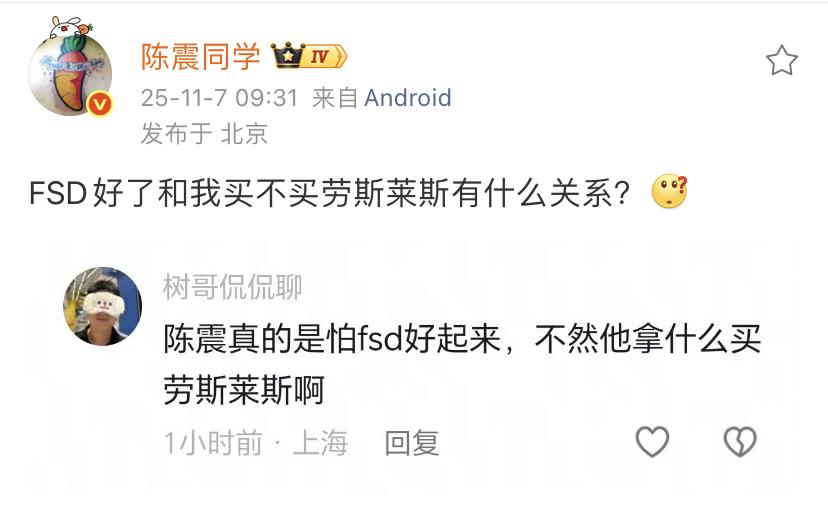 陈震:特斯拉FSD好了和我买不买劳斯莱斯有什么关系?[what] 陈震表示喜欢发这些内容,是因为为了展示物种的多样性,同时这种确实可以带来相当大的流量,大家喜欢看这种讨论。 关于为什么不买劳斯莱斯的问题,不是因为陈镇缺钱,而是现在劳斯莱斯的智能驾驶辅助达不到陈震的要求,说不定过一两年他又买了一辆。 各位是怎么看的?欢迎评论区留言。