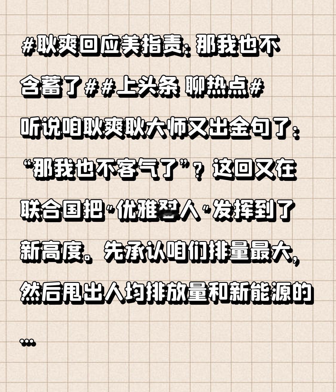 听说咱耿爽耿大师又出金句了:“那我也不含蓄了”? 这回又在联合国把"优雅怼人"发挥到了新高度。先承认咱们排量最大,然后甩出人均排放量和新能源的成果。最后慢条斯理提醒在座各位:"某国可是两度退出《巴黎协定》的专业退群选手"。 最绝的是结尾还要高举"团结合作"大旗,仿佛刚才的刀光剑影都是幻觉。会后记者采访时,估计美国代表团还在琢磨:刚才到底是谁指责谁来着?