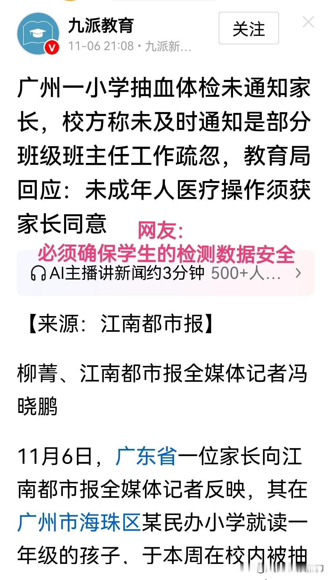 小学生在学校抽血体检有这个必要吗?为什么不可以让家长自己带学生去医院体检,然后把体检报告交给学校呢?你问我答 这并不是说有些家长事太多、没事找事,恰恰是由于现在数据安全事件和公民个人隐私被故意泄露的事情频发,很多人对于这种涉及个人和家庭成员隐私的事情等越来越敏感而且普遍产生了担忧的心理,这其实是可以理解的。 只要政府和有关部门及学校等在做这些事情之前提前跟家长们解释清楚、沟通好,并承诺确保学生个人体检结果和隐私等不被泄露,我想家长们肯定都会理解和支持的。