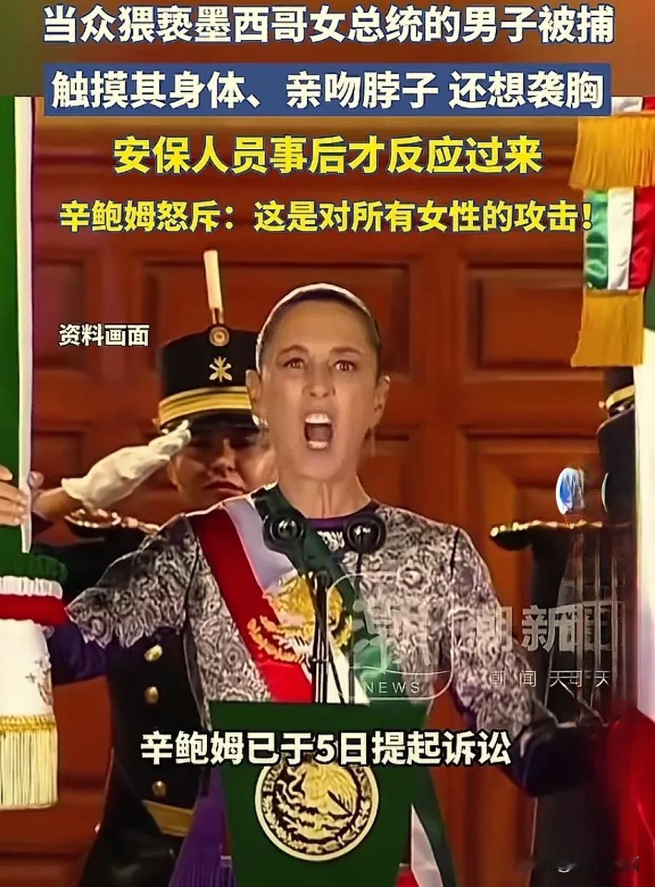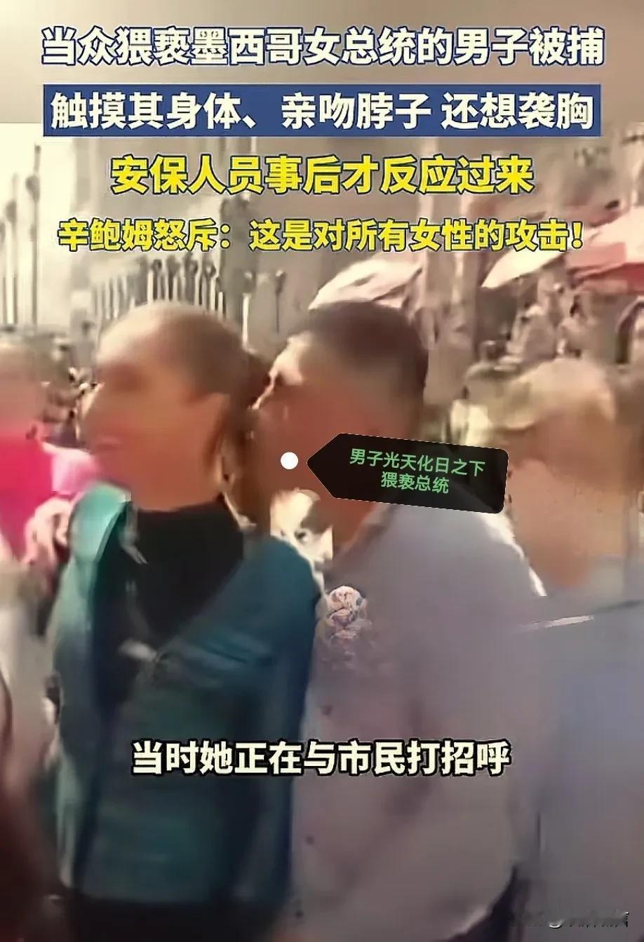 离谱啊!太离谱了,光天化日之下猥亵女总统,简直就是奇耻大辱啊! 墨西哥总统在街头时,被一名男子当众猥亵,该名男子想亲吻她,手伸到总统胸部,总统非常生气,当时总统警卫抓捕该名男子。 墨西哥总统都能遇到这种事,想想其它女同志是什么情景啊!她要求对该名男子重判,也希望墨西哥女同志做好防御工作,严厉打击犯罪行为。 性骚扰