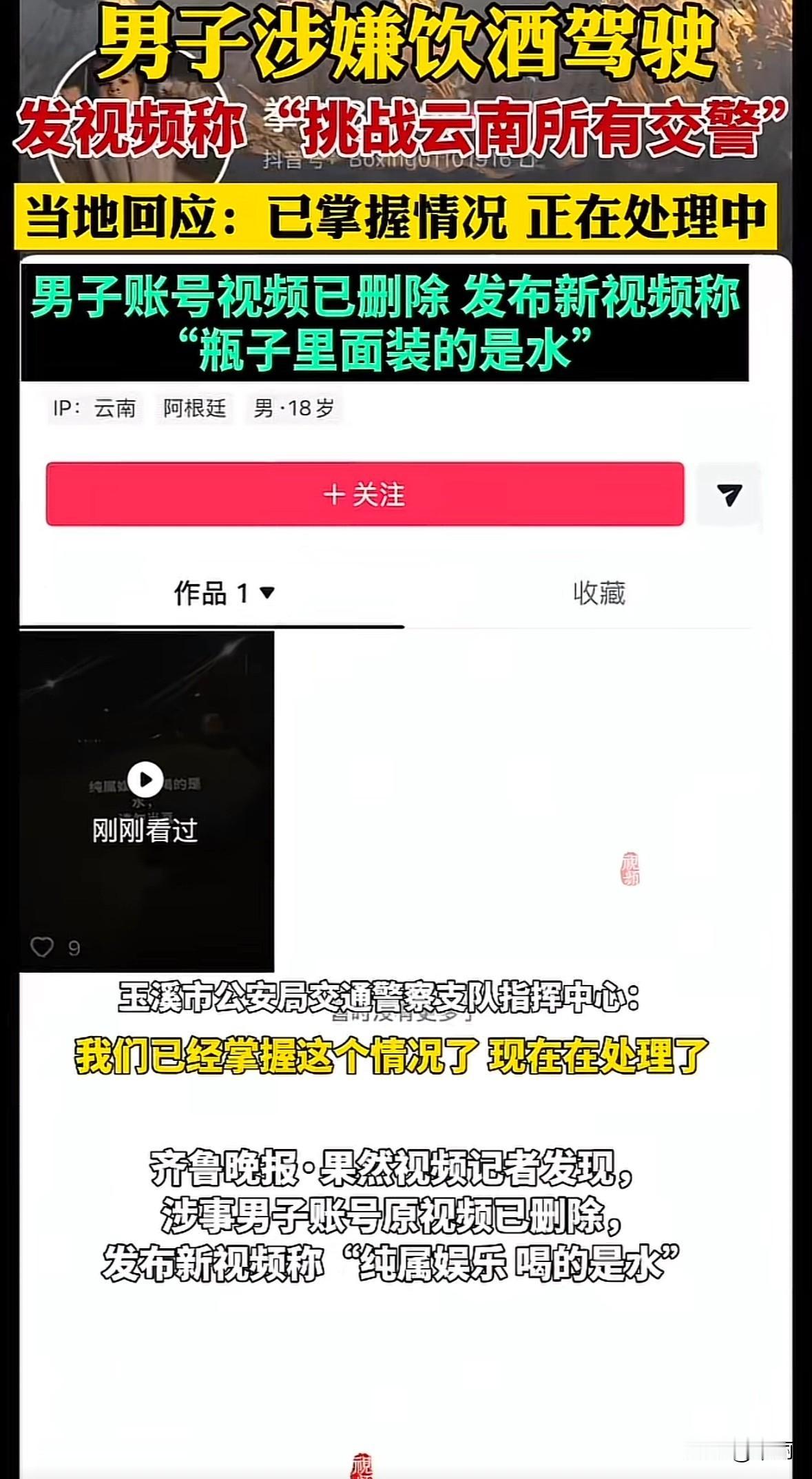 云南玉溪一名抖音用户凌晨发视频,一手拿啤酒瓶一手骑电动车,宣称要挑战当地所有交警。视频互动量过万,后来用户删原视频,称是娱乐、喝的是水。玉溪交警已经核实此事,正在处理。 电动车酒驾不是小事,法律明确非机动车不能醉酒驾驶,超标电动车可能被认定为机动车,醉驾会担刑责。网络也不是法外之地,公然挑衅交警、发布不当视频,可能违反治安管理规定。 为博眼球挑战法律和执法者,既危险又愚蠢。交通安全关乎自己和他人,执法者维护公共秩序值得尊重。每个人都该守规矩,别因一时冲动付出法律代价,网络平台更要守住底线,不传播违法失德内容。