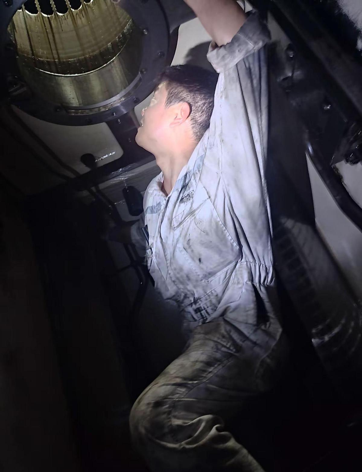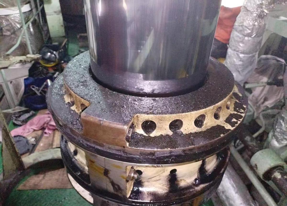 船一停,发动机就得拆。 十字头螺栓硬得像焊死的,得用劲儿掰。 活塞杆一拉出来,满