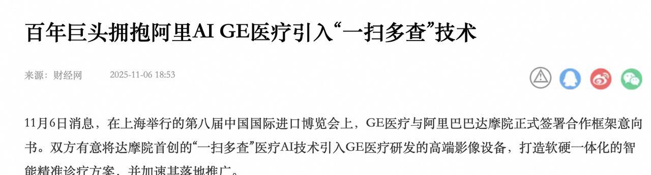 从一家美国企业的选择里,我看到了一个国际共识,时代真的变了。 以前的外国企业,依靠着积累的原始资本,在科技上对我们可谓是全方位的压制,但现在他们也意识到了我们的新技术已经迎头赶上,成为了一股不可忽视的力量。 就拿前不久上海进博会上的一个事来说吧:美国的GE医疗官宣跟阿里的合作,要引入咱们阿里巴巴达摩院的“一扫多查”医疗AI技术。 这件事为什么值得一说?因为在过去,这种合作的角色通常是反过来的,一般是我们出海去寻找科技援助。而现在,一个美国的行业巨头主动来用咱们的技术,这本身就是一个强烈的信号。 说白了,我们就是真的能解决他解决不了的问题。 对于这个“一扫多查”技术,大多数人可能还没概念,但未来一定会对我们的生活产生重大影响。 打个比方来说,它就是给目前行业顶尖的医学影像设备装上了一双“火眼金睛”。以前做一次癌症筛查,费时费力成本高,往往结果还不尽人意,很多早期的疾病靠人眼很难识别出来,等到发现时往往就晚了。 但现在,通过这项技术,一次普通的平扫CT,AI就能在短时间内,准确识别出潜在的风险。这相当于用一次检查拍片工夫,顺带做了好几次精准筛查。 目前这技术已经在国内的一些医院里帮很多人提前发现了风险,而且还连续三次登上了全球顶级的医学期刊《自然·医学》,实力是得到国际认证的。 在我看来,GE医疗这个选择可谓明智之举,不在把目光局限在美国,而是放眼全球寻找优秀的合作伙伴。其实这不单单是医疗领域的个例,早些日子宝马就在琢磨中国的智能驾驶,英伟达、亚马逊也在用上了中国优秀的开源模型。 这些变化无声,但影响很大,甚至成为了一股潮流,形成了一种国际巨头纷纷拥抱中国AI的趋势。 当这样的公司开始放下身段,主动选择中国技术时,说明我们在AI的落地和应用上,真的走到了世界前列。