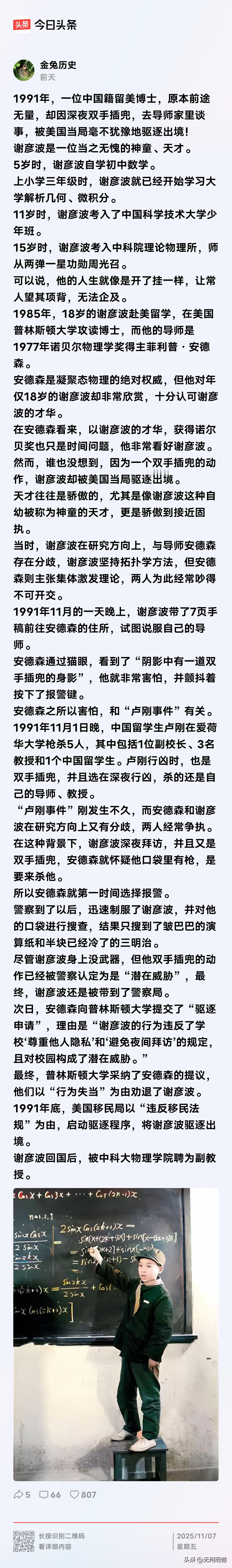 谢彦波这个人我听说过,这是一个天才少年,智商是相当高的,以前在一篇报道上看过他的故事,但是今天看到的这篇内容,是以前没有看到过的,原来在他身上还有这样的遭遇,个人觉得,用现在的眼光看,这也许也是一件好事,不知道这个天才少年现在发展的如何。