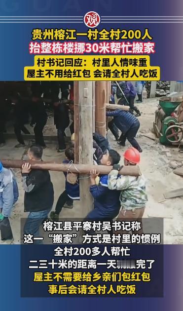 “这样的场景不多见了!”贵州榕江一村全村200人抬整栋楼挪30米帮忙搬家,村书记回应:村里人情味重,屋主不用给红包,会请全村人吃饭。 贵州榕江一个依山而建的村寨里,200 多个村民围着一栋木质吊脚楼,每个人手里都攥着粗壮的麻绳,随着一声整齐的号子,整栋楼缓缓离开原来的地基,朝着 30 米外的新址移动。 这不是电影里的特效场景,而是当地村民自发帮邻居搬家的真实画面,没有大型机械,全靠一双手、一股劲,把 “远亲不如近邻” 的道理,活成了最动人的模样。 要搬家的是村里的王大叔,他家住了几十年的吊脚楼因为村子规划需要挪位置。这栋楼是传统的木质结构,虽说不算特别大,但整体重量不轻,要是请外面的施工队来搬,不仅费用高,还可能损坏楼里的老物件。 王大叔正犯愁的时候,村支书知道了这事,在村里的广播里喊了一嗓子,“王家要挪房子,有空的都来搭把手”,没想到当天就来了 200 多人,连隔壁村的亲戚都特地赶过来帮忙。 搬家前一天,村民们就开始做准备。年轻人上山砍来结实的杉树做撬棍,妇女们则把麻绳剪成合适的长度,还煮了一大锅红糖姜茶放在旁边,方便大家随时喝。 有经验的老人负责指挥,在楼底垫上滚木,又在移动路线上铺上木板,防止楼体在移动时受损。王大叔想给大家发点误工费,被村民们笑着推了回去,“都是乡里乡亲,帮个忙哪能要钱”。 正式搬家那天,天刚蒙蒙亮,村民们就陆续到了。大家按照老人的安排,分成十几个小组,有的负责拉麻绳,有的负责用撬棍调整方向,还有的在旁边观察楼体情况,防止出现倾斜。随着领头老人的号子声,大家一起发力,原本沉重的吊脚楼慢慢动了起来。 走几步就要停下来调整滚木位置,遇到不平的路面,男人们就趴在地上垫木板,女人们则递水递毛巾,连村里的小孩都在旁边帮忙捡散落的树枝,整个场面热闹又有序。 30 米的距离,平时走路也就几十秒,可搬着一栋楼走,却花了整整三个小时。期间没人喊累,也没人中途退出,有人手被麻绳勒红了,就换个人接着上;有人额头渗满了汗,用袖子擦一把继续使劲。 直到吊脚楼稳稳落在新地基上,大家才松了口气,围着楼欢呼起来。王大叔看着满身是汗的村民,眼眶都红了,拉着村支书的手说 “这可咋感谢大家啊”,村支书拍着他的肩膀说 “咱们村就这规矩,人情味重,不用给红包,等房子收拾好了,请全村人吃顿便饭,大家就高兴了”。 其实在榕江的很多村寨,这种互助的传统已经延续了几十年。以前村里有人盖房子,村民们会自带工具去帮忙,今天你帮我,明天我帮你,不用算得那么清楚。像这样 “抬楼搬家” 的事,虽然不常见,但只要有人需要,大家都会主动凑过来。 村支书说,现在村里年轻人大多在外打工,但只要村里有事,在外地的人都会尽量赶回来,实在回不来的,也会托人带点东西回来。这种不分你我的情谊,让整个村子像一个大家庭,不管遇到啥困难,只要大家拧成一股绳,就没有解决不了的问题。 随着乡村发展,很多地方的生活方式变了,但榕江这个村寨的互助传统却一直没变。这种刻在骨子里的善良和团结,不仅让村民们的日子过得更温暖,也让更多人看到了乡村最动人的模样。毕竟,再先进的机械也搬不走人心,再富裕的生活也替代不了邻里间的真情。 对此,你们有什么看法,欢迎评论留言~