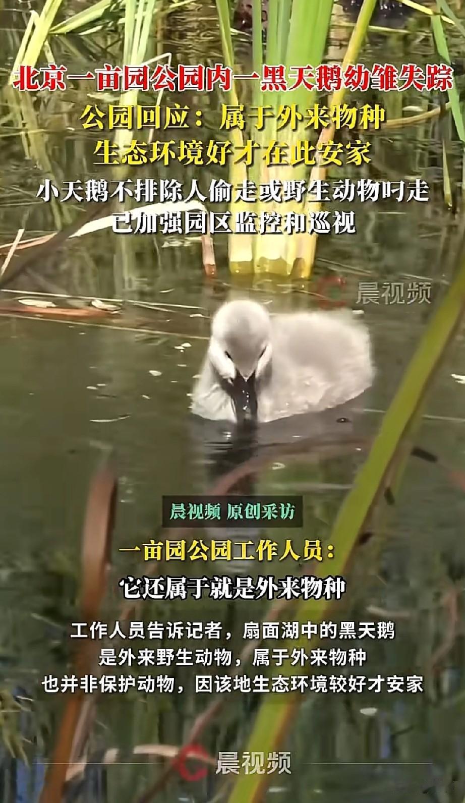 北京一亩园公园扇面湖的黑天鹅幼仔丢了一只,之前成年黑天鹅孵出两只幼雏,有市民用视频照片证实,现在只剩一只,疑似被偷。园方说黑天鹅是来安家的外来野生动物,不是养殖的,发现失踪后已经报警,还加装了监控。警方也去现场调查了,暂时没找到嫌疑人。 可能有人觉得黑天鹅不是我国保护动物就无所谓,但新版《北京市野生动物保护管理条例》说了不能随便捕猎。公园生态好才吸引它们来,不管是不是保护动物,都是生命。就算不是偷,也该好好爱护,别打扰它们的生活。希望警方能尽快查清真相,也盼大家多一份敬畏,让这些小动物能安心生存。