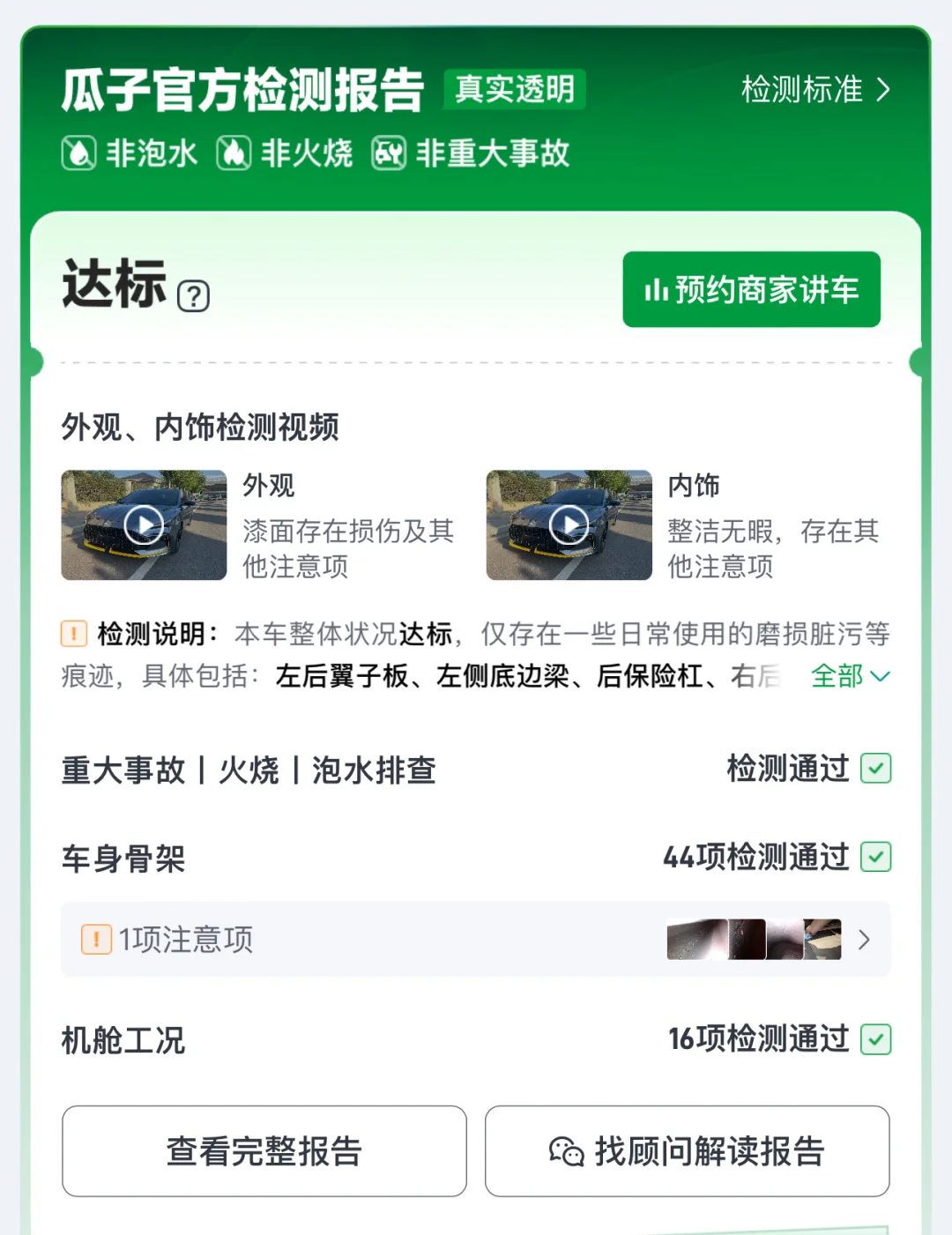瓜子的工作人员直接送车上门试驾,还带了检测报告向我详细的介绍了车的情况,比如方向盘的细致磨损指给我看,同步了一下车的基础功能使用,瓜子每辆车都有详细的车况检测报告,像电车还有专属的电池报告,整个过程下来没有太大的问题,就直接付款了,而且有说明购车后发现所购车辆在交付前存在重大事故、火烧、水泡等问题可终身原价退车完全不用担心。对比了一下瓜子二手车平台才6w+价格比线下车行便宜了1万+,就提车啦!跟朋友出去玩的时候朋友还以为我买的新车哈哈