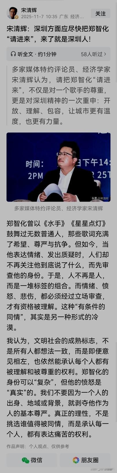 有一位著名经济学家说,深圳方面应尽快把郑智化“请进来”,来的都是客,来了就是深圳人!这不仅是对一个歌手的尊重,更是对深圳精神的一次重申! 估计郑智化非常感谢这货!但是,我们河南人都不好意思说,原来发出这种声音的是我们河南人——多家媒体特约评论员、经济学家宋清辉教授! 啥也不说了,我们河南网友希望郑智化为@宋清辉 重新唱一遍,曾经我们非常喜欢的一首歌:抬头的一片天,是蓝色的一片天,深圳机场有监控,我居然没看见。