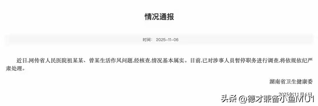 曾医生和祖院长之间,究竟是利益纠葛还是爱情使然? 此事在网友间闹得沸沸扬扬。如今湖南省卫健委通报已出,二人相关视频基本属实,他们已被暂停职务接受调查。不少网友认为,个人生活隐私不应被无限放大,只要医生能认真对待病人,就是医德高尚、受人民爱戴的好医生。 然而,时代虽变,道德底线不可缺失。当下有些人的三观实在令人难以苟同。生活作风不良之人,工作作风又能好到哪儿去?那些满嘴仁义道德的人,私下却尽干些龌龊之事,表里不一、伤风败俗!大家可得教育好自己的子女。若二人都是单身,不涉及家庭问题,他们爱怎样就怎样,我们也不会过多关注;反之,这才会沦为丑闻。 上学时,老师教导我们要德智体全面发展,且“德”字当先。毕业分配后,领导也强调培养人才要德才兼备,“德”排首位。同样,作为白衣天使,也需德才兼备,且医德应重于医术。试想,一个无德的医生,能对患者有多好?这种生活作风问题,会破坏他人婚姻家庭,甚至可能闹出人命,后果不堪设想,必须将其开除。 对此大家怎么看?