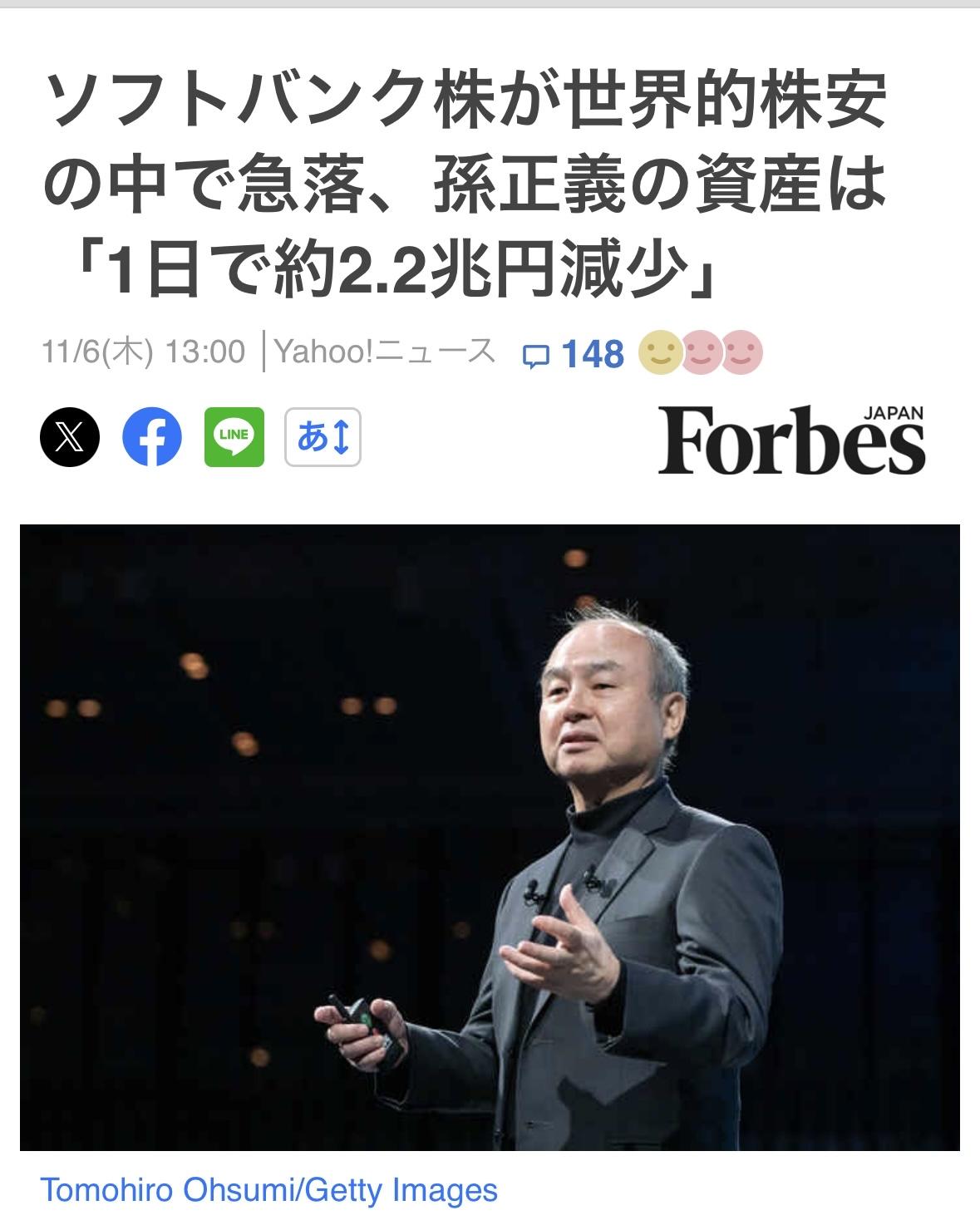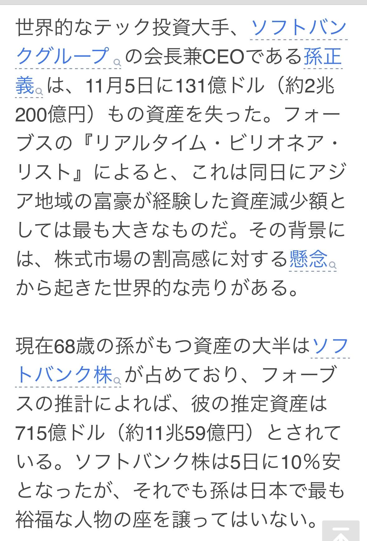孙正义11月5日财富缩水131亿美元。据《福布斯》实时亿万富翁排行榜显示,这是当天亚洲富豪财富损失最大的一天。此次下跌源于全球股市抛售潮,投资者担忧股市估值过高。 现年68岁的孙正义持有的的大部分财富是软银股票,据《福布斯》估计,他的身价约为715亿美元。尽管软银股价在11月5日下跌了10%,孙正义仍然是日本首富。