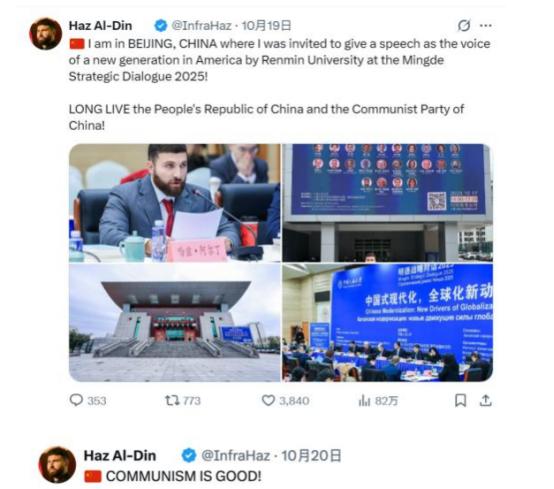 10月下旬,美国共产党执行主席哈兹·阿尔丁首次访华,实地考察中国后,狂赞中国:“中华人民共和国万岁!中国共产党万岁!”“中国的现代化不是照搬西方模式,强大国家的崛起也能成为全球稳定的力量”。 2025年10月17日至21日,美国美利坚共产党执行主席哈兹·阿尔丁第一次踏上中国土地。一趟走访,他看得明明白白,回去就“开麦狂赞”中国。 这次来华,阿尔丁主要是参加中国人民大学主办的“明德战略对话2025”。在主论坛上,他跟中、俄及欧洲的学者们聊起了人工智能,越聊越有感触。 他当场就说,人工智能让生产力和生产关系的矛盾越来越突出,西方那套全球化模式早就跟不上了,中国在技术和治理结合上的探索,给世界指了条新路子。 会议间隙,阿尔丁没闲着,专门安排了实地走访。他特意去了中国共产党历史展览馆,从近代屈辱史看到民族复兴历程,每一幅照片、每一件文物都看得格外认真。 紧接着他又去了北大二院旧址,在那里了解中国早期革命历史,还接收了美国共产党前主席威廉·福斯特1958年致毛泽东信件的复本。 他没光看历史,还去感受现代中国的活力。他坐了北京地铁,看着车厢里井然有序的人群,忍不住在社交平台发了张照片。他还逛了小米和华为的门店,拿着最新款的国产手机翻来覆去看,连说这些产品的创新力超出预期。 随后,他特意去了中关村国家自主创新示范区展示中心,在那里亲眼看到了中国在智能制造领域的最新成果,从无人生产线到智能机器人,每一样都让他驻足许久。 10月19日,阿尔丁在X平台发了第一条访华动态。他配着自己在研讨会发言的照片写道:“我正在北京,受邀在中国人民大学的明德战略对话上发表演讲,代表美国新一代发声。中华人民共和国万岁!中国共产党万岁!”这条内容很快火了,浏览量超80万次,不少网友在评论区说“美国该向中国学习”。 第二天,他更直接,就发了五个字:“共产主义是好的!”这句话再次引发热议,近30万次浏览量里,有网友留言“中国特色社会主义已证明是成功的”,还有人说“美国需要共产主义”。10月21日,他在天安门前拍了张照片,配文里提到毛泽东思想,说西方媒体长期误导世界,自己亲眼所见后,所有偏见都烟消云散了。 阿尔丁还接受了中国日报的采访,他在采访里说,在美国,一个运转良好的社会几乎成了幻想,而中国的秩序和现代化建设特别让人震撼。他直言西方媒体故意妖魔化中国,根本原因是中国不受美国统治阶级操控,反观美国政客,早就被私利和腐败牵着走了。 他多次强调,中国的现代化路子跟西方完全不一样,这给世界其他国家提供了新的思路。他特别提到,中国的发展证明了和平与发展并不冲突,强大的国家照样能成为全球稳定的力量。这些观点跟他在研讨会上的发言一脉相承,看得出来是实打实的心里话。 美利坚共产党官方账号也跟进了他的行程,发布了他在北大参观、接收历史信件的内容,这条动态同样登上了热门,单条浏览量接近三十万。有网友调侃他的行程是“东天取经”,说他用行动完成了思想上的长征。 这五天的中国之行,彻底改变了阿尔丁对中国的既有认知。他没靠媒体报道下判断,而是用脚丈量、用眼观察,最终发出的赞叹自然格外有分量。他的发声不仅让更多美国民众看到了中国的真实面貌,也让中美两党、两国人民的联系变得更紧密了。