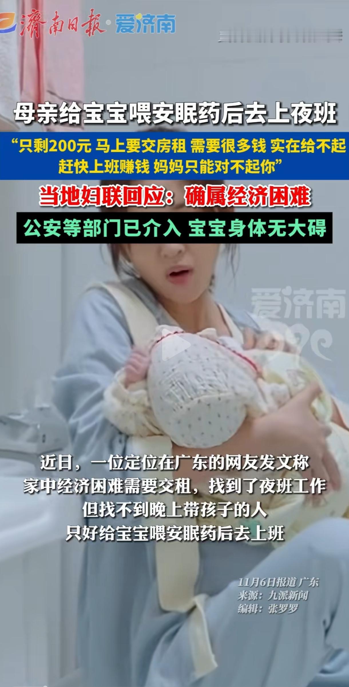 妈妈给宝宝喂安眠药,好去上夜班挣房租 公安介入,宝宝身体无大碍,当地妇联回应,确属经济困难。 那么,当地妇联后续该做些什么呢,街道民政办的同志们呢,你们在哪里? 家庭原子化后,难有以前家族宗族那样危急时候的帮手了,想鼓励生育,仅仅是给万把块生育补贴是没用的