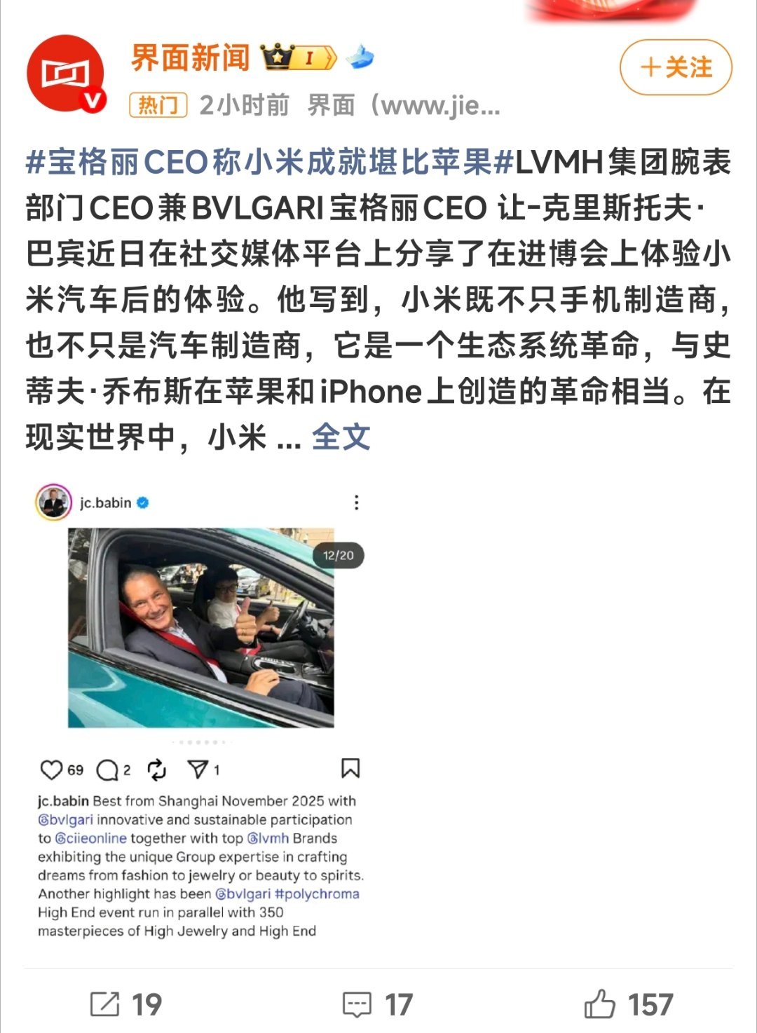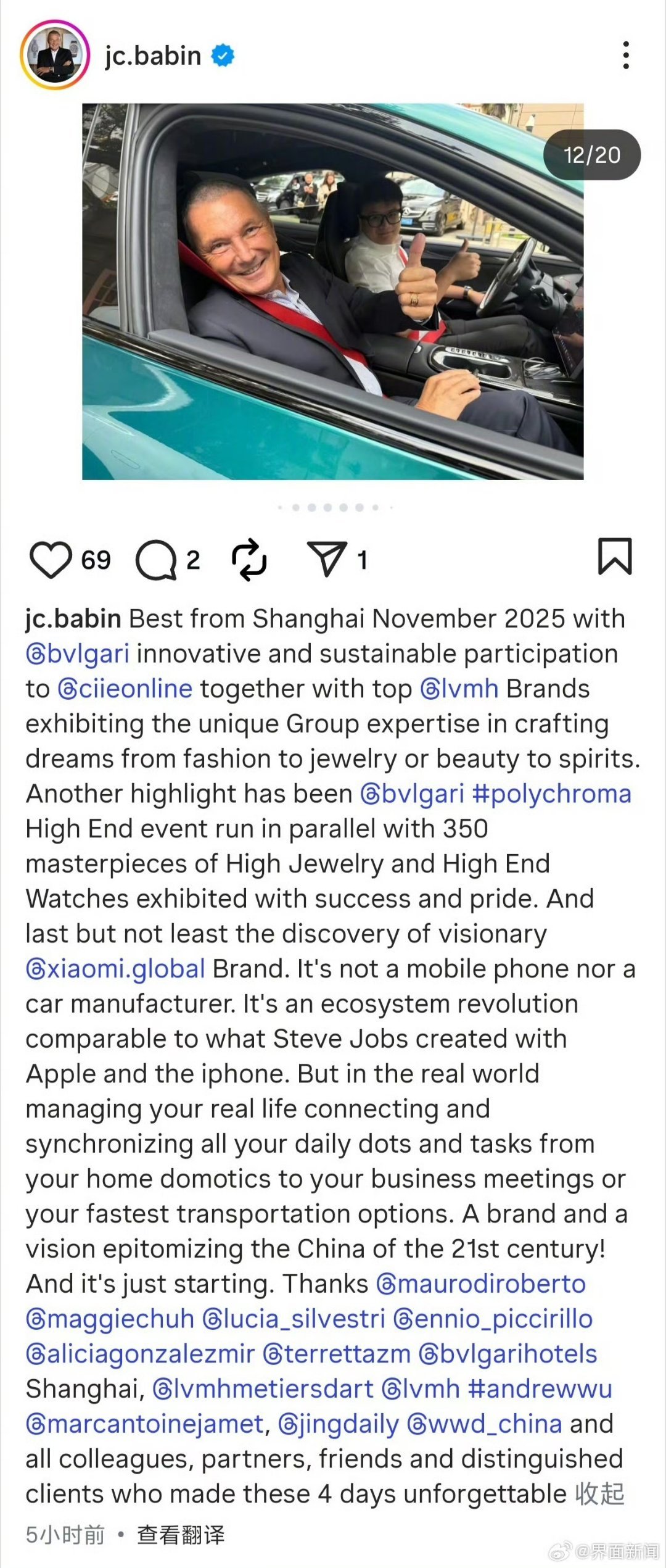 宝格丽CEO说 小米用生态体系打破边界,就像当年乔布斯带着iPhone重新发明手机那样,正在重塑科技生活方式!他还表示,这只是开始……