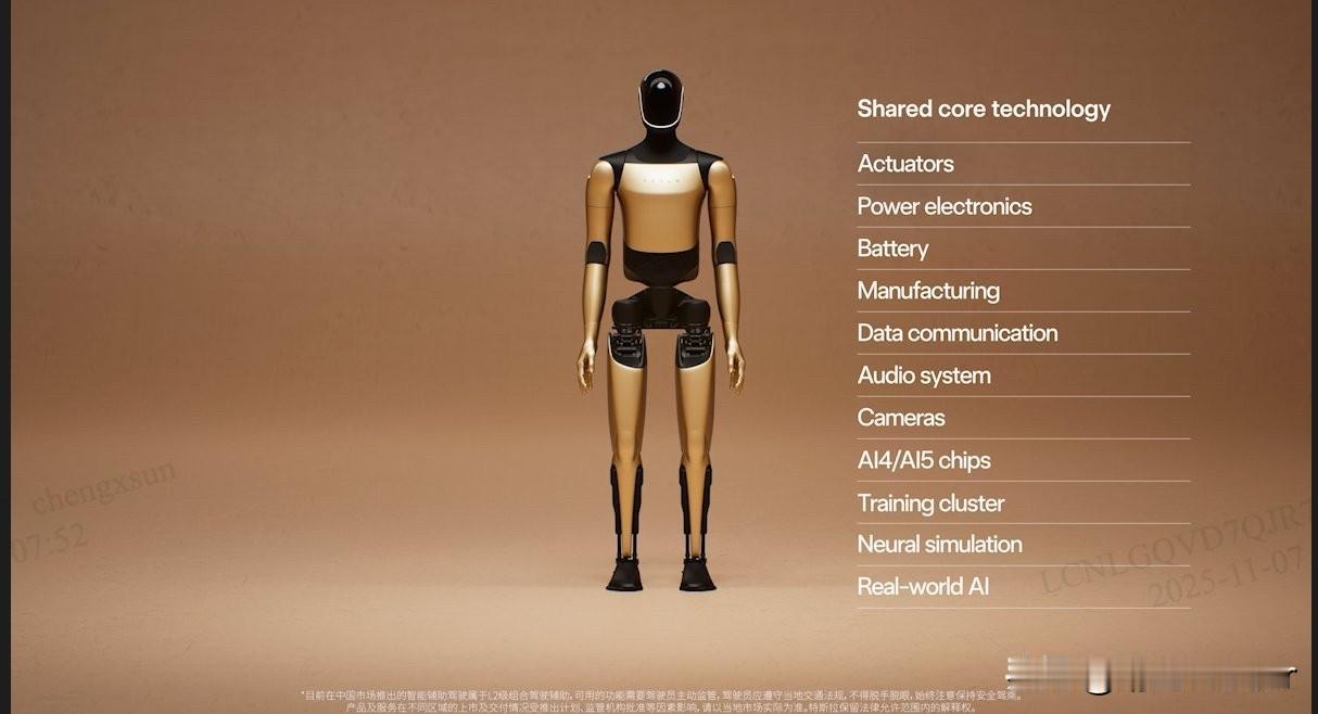 【关于人形机器人】 1、特斯拉人形机器人将成为史上最伟大的产品,预计市场规模达数十亿台,其中个人机器人与工业用途机器人的比例大概在1:3到1:5。 2、生产计划史无前例:机器人产线将启动“史上所有大型复杂制造产品中最快的产能爬坡” 。从弗里蒙特工厂启动年产100万台的生产线,之后在得州建年产能1000万台的产线。 3、人形机器人将在明年启动量产,确保人类安全优先。一旦实现每年100万台的持续产量,生产成本将在20,000美元左右。 4、加速迈向可持续的富足:人形机器人将真正消除贫困,提供超越人类外科医生的精准医疗,为每个人提供“超乎想象的医疗服务” 。人形机器人经济效应巨大,可将全球经济规模扩大10-100倍。 5、版本迭代:目前展示的是第2.5代人形机器人,明年将启动第三代特斯拉人形机器人生产;人形机器人采用年度发布周期,每次都会有重大改进。 6、独特优势:特斯拉已突破复杂的手部工程、现实世界人工智能和大规模量产三大难点。特斯拉人形机器人本质上是“有胳膊和腿的智能车”,与特斯拉车辆现有的电池、电机、人工智能等技术同源打造。 【关于智能辅助驾驶与 Tesla Cybercab 特斯拉赛博无人驾驶电动车】 7、特斯拉辅助驾驶技术使全球车队每680万英里仅发生一起事故,安全性为美国平均驾驶员的十倍,较2018年接近翻倍;将来自动驾驶技术预计将安全性能再实现数量级的提升,可挽救数百万生命、避免数亿事故。 8、智能辅助驾驶V14.1版本已经很流畅,V14.3版本将达到“睡一觉醒来就抵达目的地”的水平。 9、已完成全球首次无人驾驶车辆从工厂自动交付到新车主家中。目前的特斯拉车辆已可以自动驶出工厂,进入物流停车场。 10、FSD Supervised目前已在6个国家/地区推出,欧洲需客户推动审批。 11、Tesla Cybercab 特斯拉赛博无人驾驶电动车:首款专为无人驾驶设计的特斯拉Robotaxi运营车辆,无方向盘、无踏板、无后视镜,每公里运行只需几毛钱。2026年4月在得州超级工厂启动量产,预计5-10秒生产一辆,年产能从50万飙升至200-500万。 12、整体生产扩张:由于智能辅助驾驶问题已解决,特斯拉将“以最快速度扩大车辆产量” 。明年车辆产量目标增长50%,年化达260-270万;2027年底400万,2028年底500万。 13、自动驾驶成本:目标将每英里成本降至0.20美元以下,预计自动驾驶将减少车辆总数但增加总体行驶里程(因为车辆使用的便利性提升)。 【关于人工智能芯片与制造创新】 14、AI 5芯片:专为特斯拉人工智能优化,功耗仅为英伟达Blackwell的1/3,性能相当,成本却不足其10%。更高效地采用整数运算,在能效和硅片效率上远超竞品。性能有望比 AI4 高出50倍,目标 2027 年实现量产,将应用于车辆、机器人、培训和数据中心。 15、AI 6芯片:目前已在规划中,可在AI 5投产后一年内同厂升级,实现AI 5双倍性能。 16、芯片短缺应对:芯片和电力是未来发展的核心瓶颈,特斯拉已准备好能源解决方案,但芯片供应仍需扩大。特斯拉可能自建“Terafab”巨型工厂,目标建设每月100万片晶圆的大型晶圆厂。马斯克深度参与设计,甚至“做梦都在画芯片”。 17、电池创新:Megapack简化设计,可直接输出35千伏,无需变电站;4680电池用于Cybercab/赛博越野旅行车/特斯拉人形机器人。特斯拉在得州建立了除中国之外的全球最大锂精炼厂(初始规模50吉瓦时),以确保供应链韧性。 【关于其他产品与运营更新】 18、Tesla Semi 电动半挂卡车:明年将进行大量技术改进,800公里续航,800千瓦行驶功率,1.2兆瓦充电功率,能耗1度电/公里。效率更高、有效载荷更大、专为自主运行而设计,2026年将在内华达超级工厂量产,目前已经在为百事等公司做运输车辆。 19、超级充电:全球最大的超级充电网络,覆盖地球任意角落;已经对很多其他品牌电动车开放使用。过去一年,特斯拉超级充电网络新增1.2万个充电桩(同比增长 18%)、提供6太瓦时电量(同比增长 29%)、稳定运行时间接近100%。 22、Roadster:马斯克表示,他最近提到的“史上最震撼的产品演示”指的就是全新Roadster,超乎想象,超越任何现有车辆,2026年4月1日将发布新技术演示,预计12-18个月后量产。他称其为“有史以来最酷的车,如果它还算是一辆车的话” ,将集“007詹姆斯·邦德所有座驾技术”之大成。 【关于公司使命与未来愿景】 23、公司使命从“加速世界向可持续能源的转变”升级为“加速世界迈向可持续的富足”:人们将可无限获取商品、服务与医疗,同时守护人类在地球的生存环境。