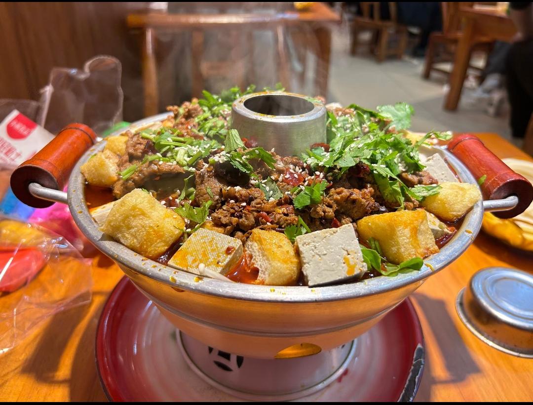 就这锅谁看了不迷糊啊! 刚上桌那股香辣味儿就钻鼻子里了!小铁锅咕嘟咕嘟冒热气,红油裹着嫩豆腐、吸饱汤的油豆腐,上面堆着脆生生的香菜和喷香的肉末,看着给我馋得。 夹块嫩豆腐,一咬就爆辣汁,鲜得舌头都麻了;油豆腐软乎乎的,裹满肉酱香得想嘬皮。这锅越煮味儿越浓,辣得嘶哈嘶哈还停不下筷子,配口米饭直接给香迷糊了。 吃完擦嘴时满手油都舍不得擦,就这热乎劲儿,不比啥大餐看着有胃口呀! 干饭人看见这锅,谁能扛得住啊?