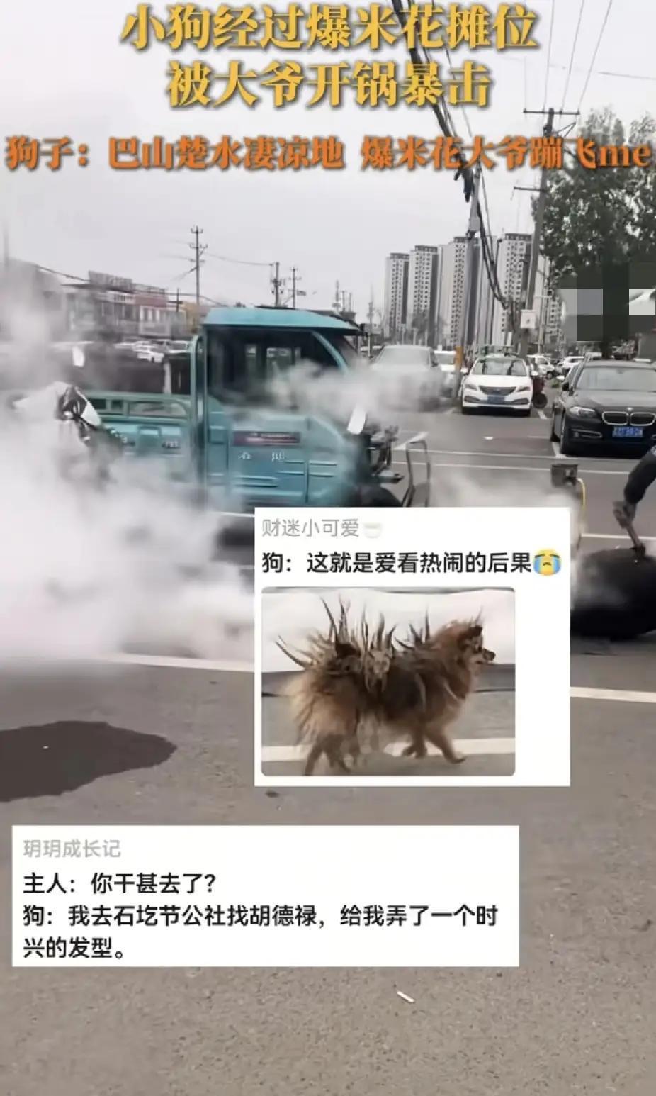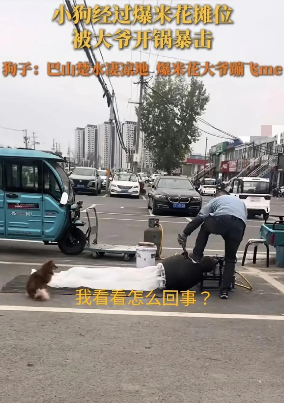 安徽街头这只小狗太惨了——凑到爆米花摊看热闹,下一秒大爷“开锅暴击”,巨响+蒸汽