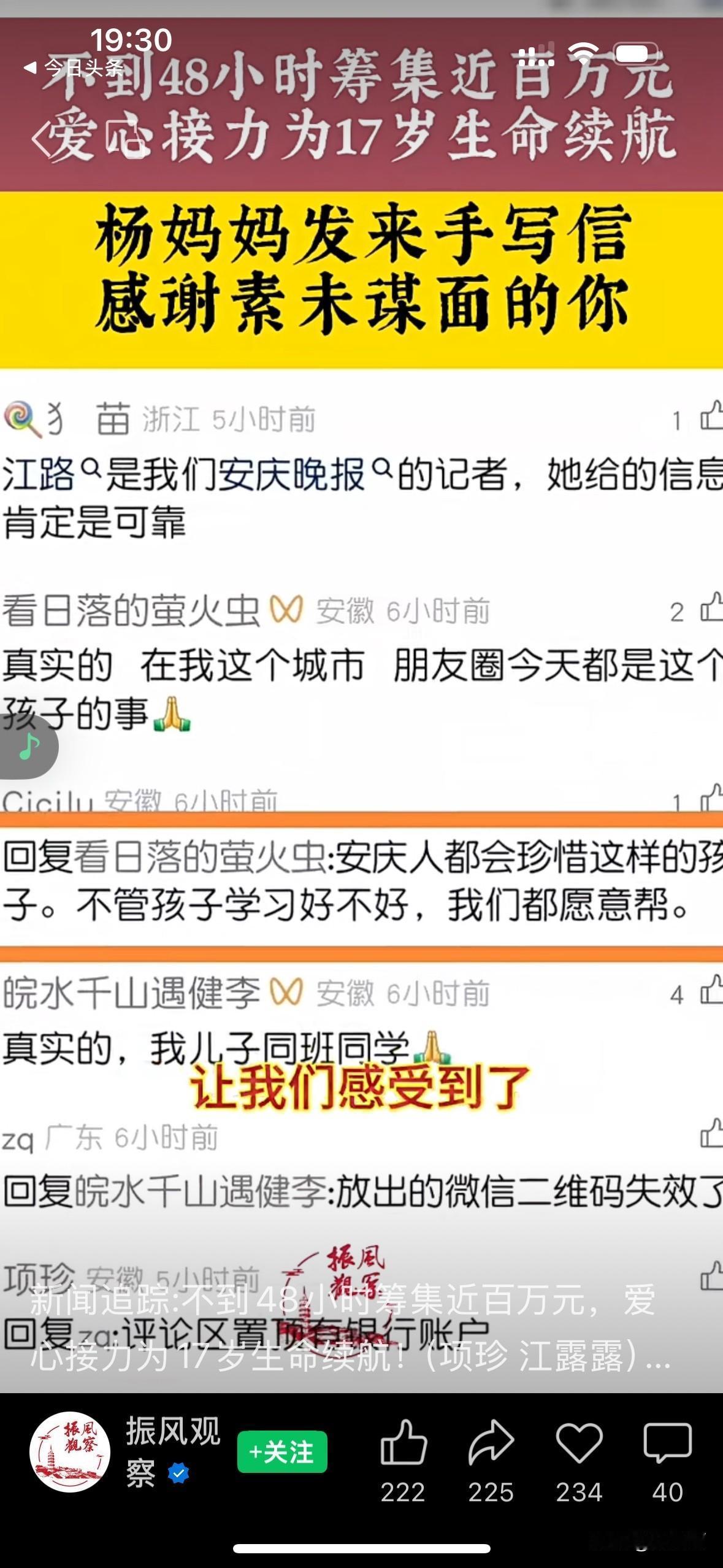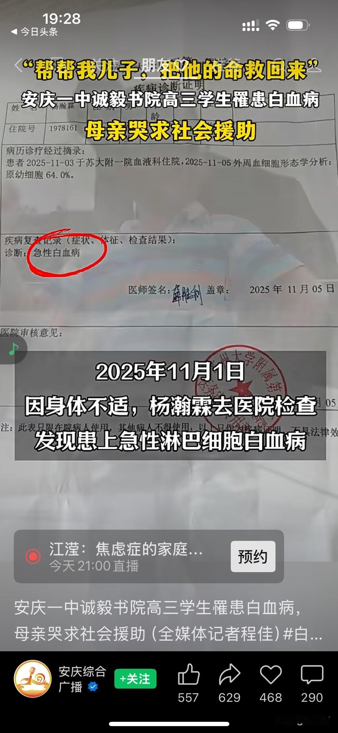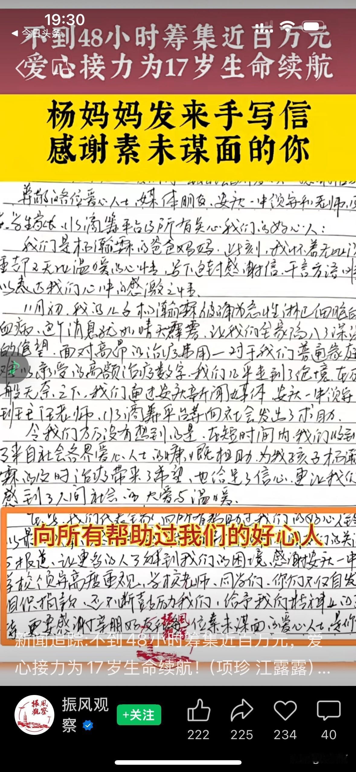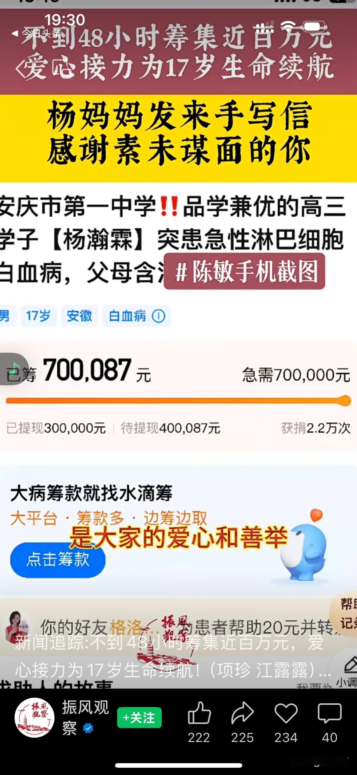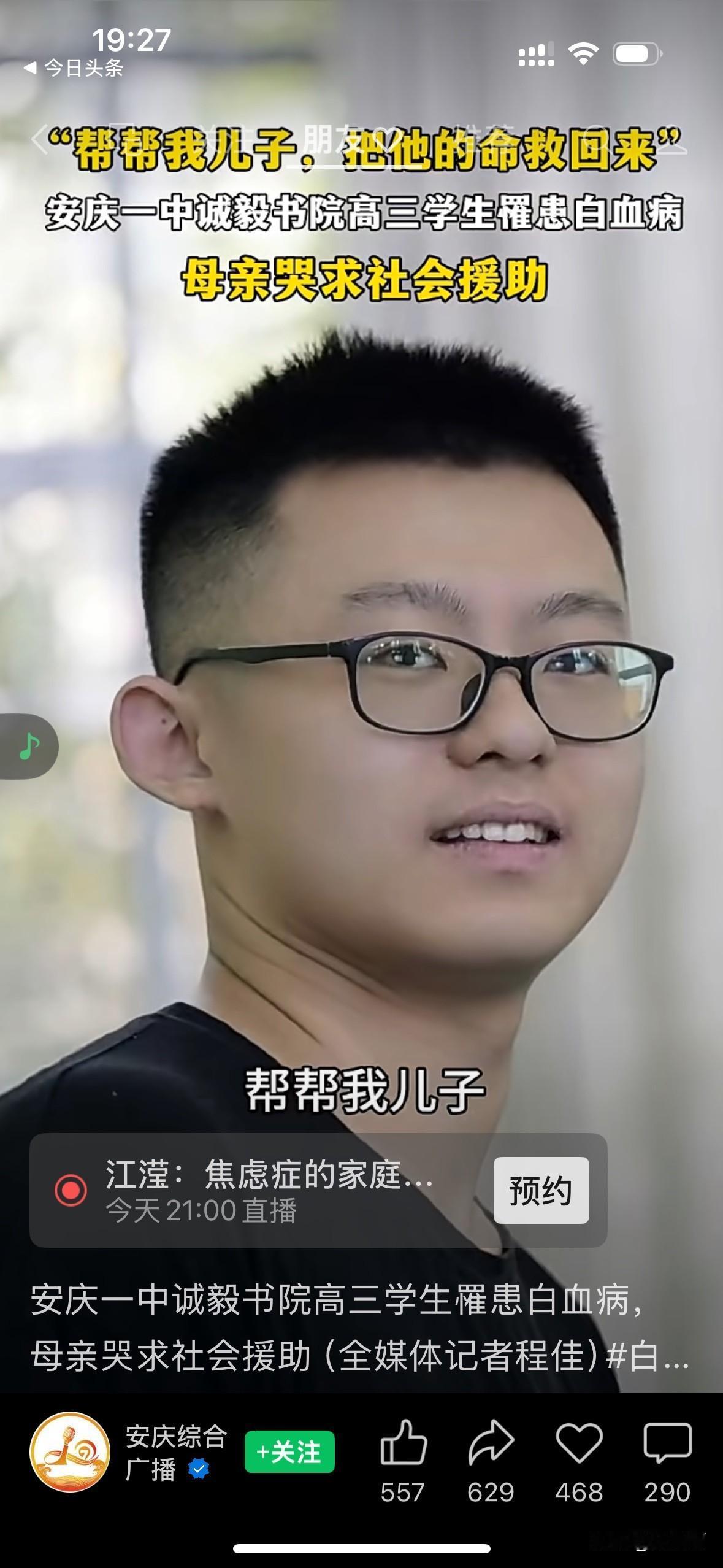 “这座小城是温暖的”!“17岁少年身忠白血病,妈妈求助:帮帮我儿子” 当杨妈妈的求助视频在安庆,这座历史悠远的小城朋友圈里,传播开来时,大家都迅速地伸出了援助之手。 杨妈妈的儿子是一位品学兼优的好学生,在安庆一中诚毅学院读高三。今年11月初,孩子因发烧住院被确诊为急性淋巴细胞白血病。 医生说:白血病先要化疗,还要等待骨髓配型,配型成功后移植,后期还要康复治疗,预估费用高达百万以上 这个消息犹如晴天霹雳,炸碎了他们家平静的生活。杨爸爸是一位退役军人,现在在当护林员,而杨妈妈则是下岗职工,家里的收入并不高。 面对高额的医疗费用,杨妈妈并没有放弃治疗。她对儿子说,你一定会治好的,我会尽一切努力筹钱帮你治病 学校得知杨同学的病情之后,很快就组织了募捐活动,师生们踊跃捐款,并将求助视频转发到朋友圈。而当地的新闻媒体关注到了孩子的情况,也向妈妈提供帮助。 爱心捐款从四面八方涌来,不到48小时,已经筹集了近百万。杨妈妈说感谢大家无私的爱,正是你们这些素未谋面的爱心为我们点亮了前行的路,是大家的善举让我们一家有了与病魔抗争的勇气。 只要人人都献出一点爱,我们的世界将温暖无比! 取材网络,侵删