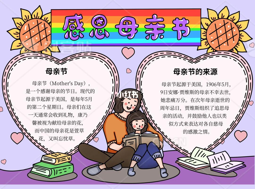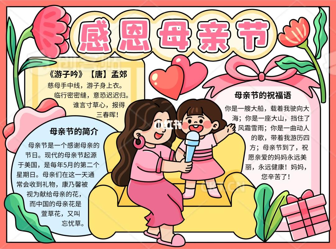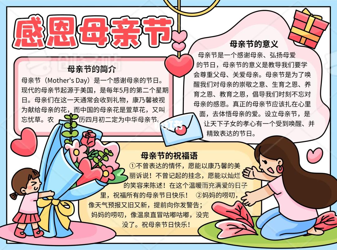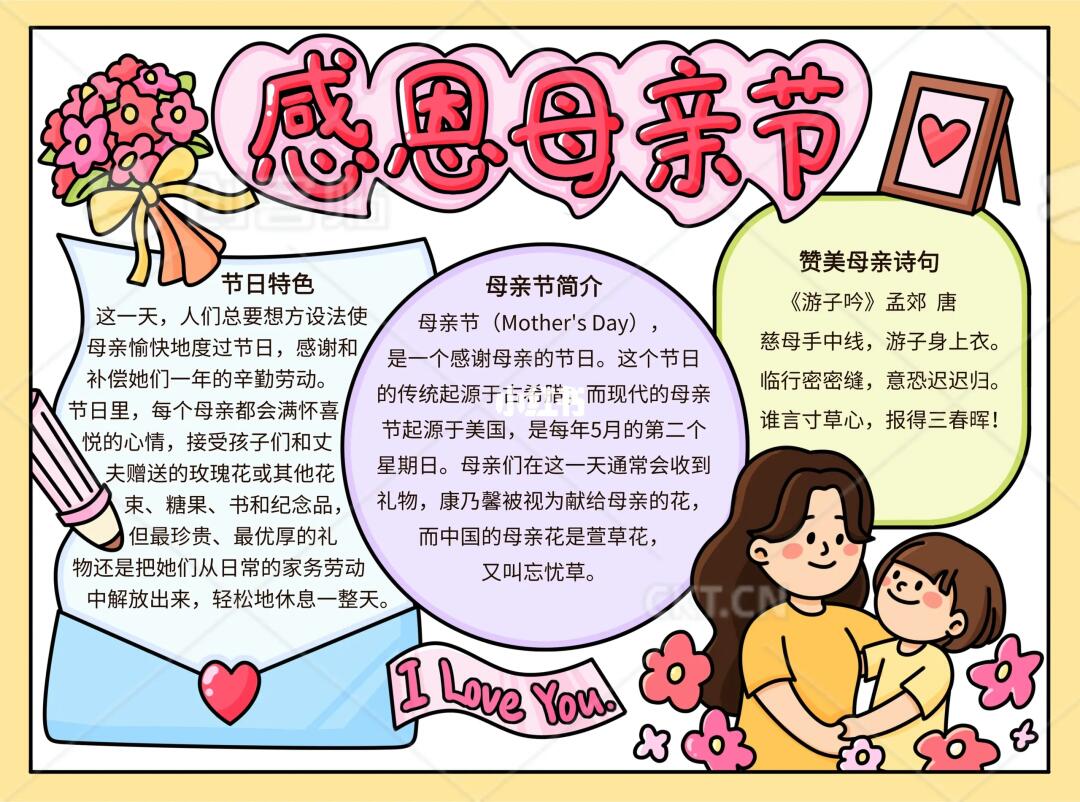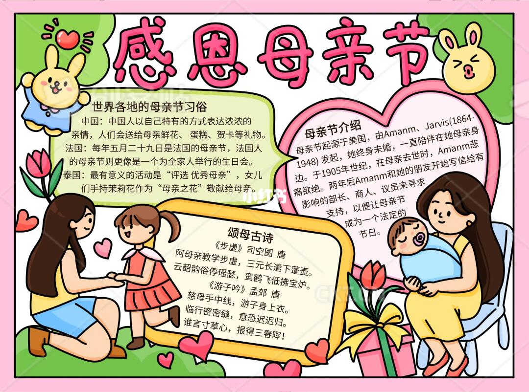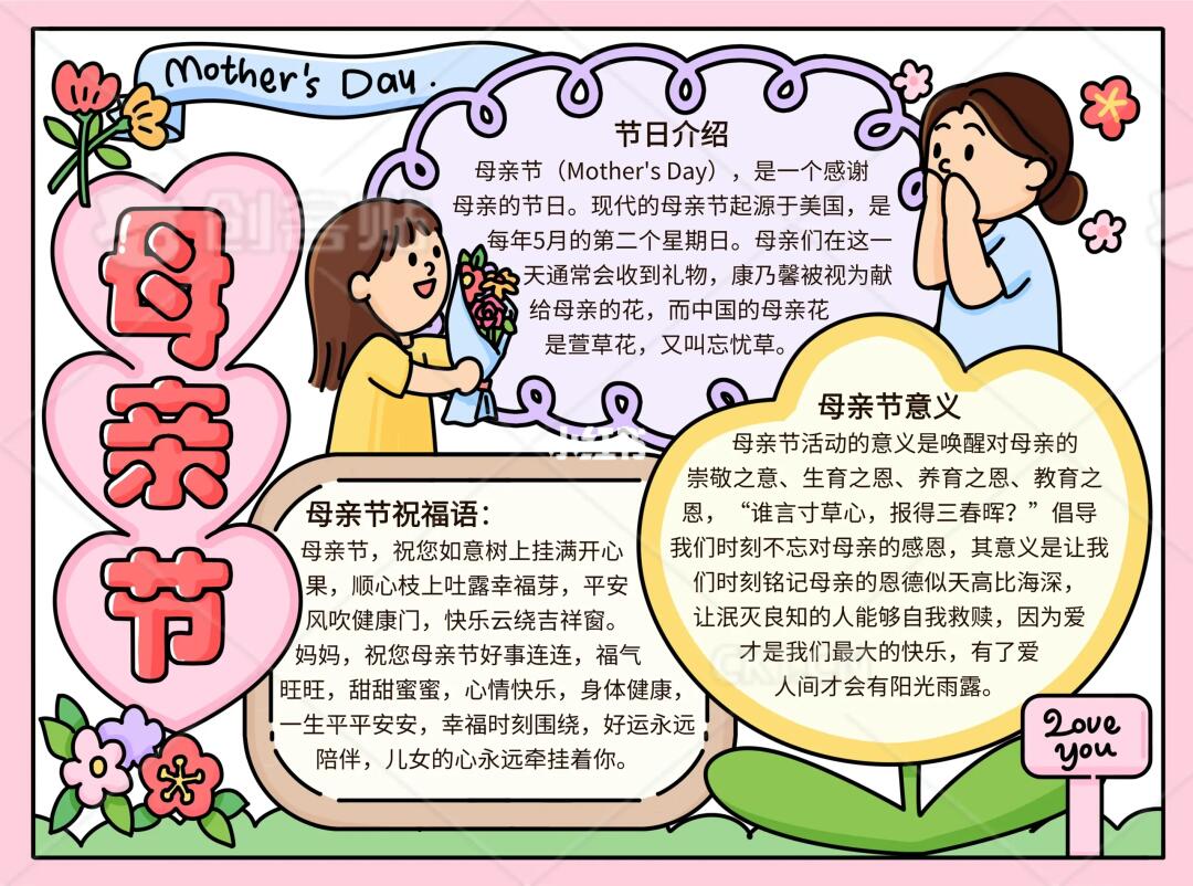 👩🏻🦰“母亲节”系列主题手抄报模版 🎨标题、元素、图片、文案素材适用于主题画、手抄报、黑板报、手账作业,及相关的美术课程。 📚模版图片来源于