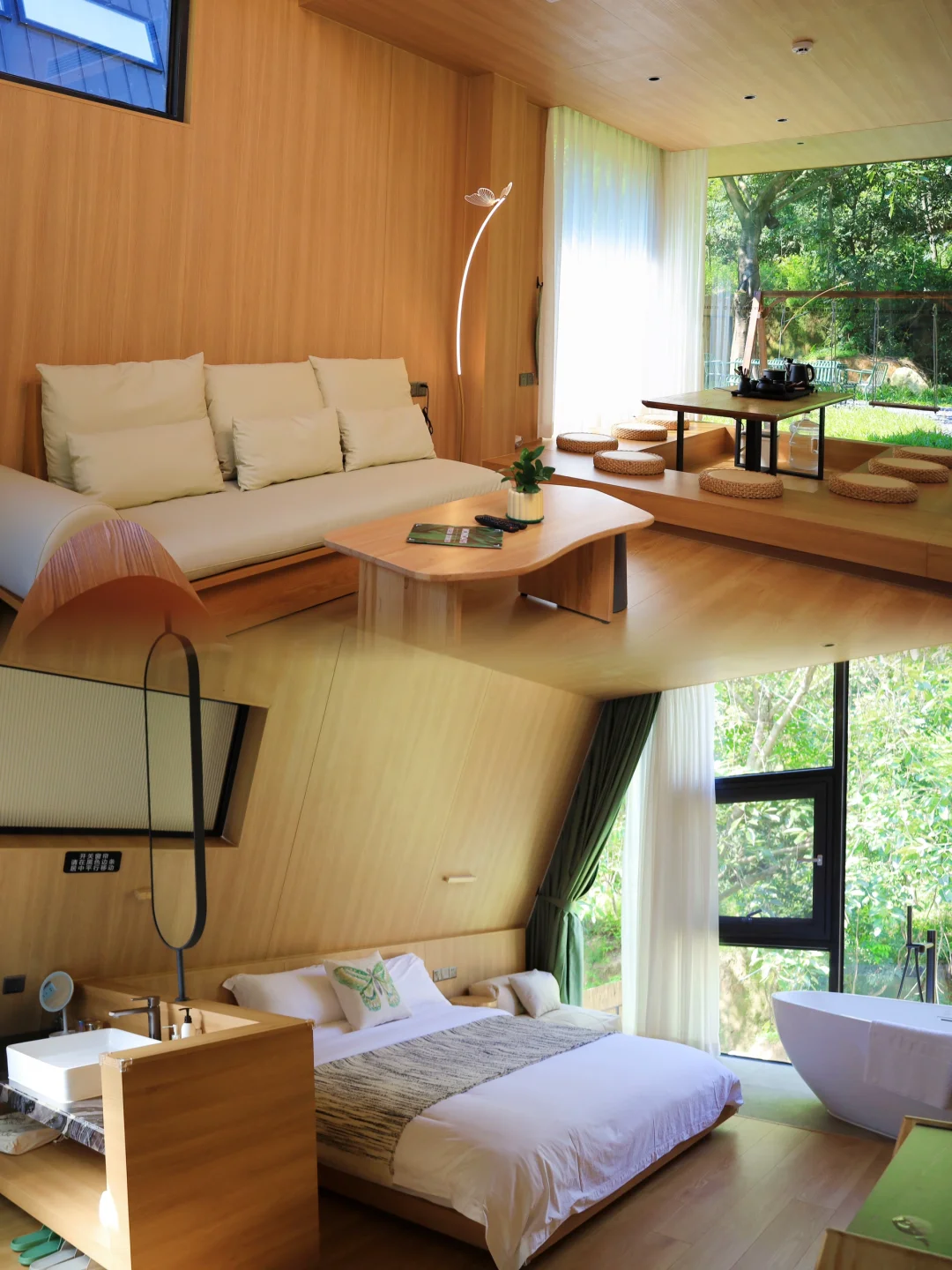 🔸我们特意选择了远离城市喧嚣的深山民宿,住进了双层3房的别墅,宽敞的客厅和茶室,很适合家人朋友聚会;每个房间均有落地玻璃窗,躺在床上、坐在沙发上、泡在澡浴缸里,都能直接看到窗外景色,非常惬意~