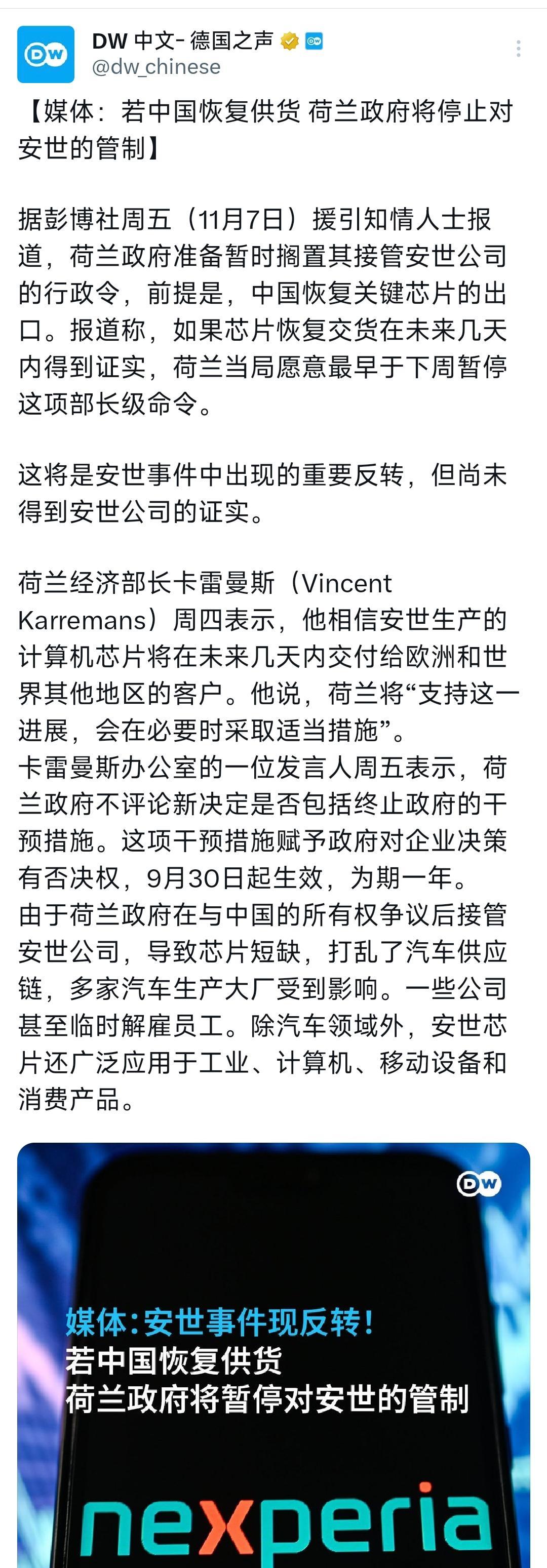 德国之声昨晚(11月7日晚)写道:“【媒体:若中国恢复供货 荷兰政府将停止对安世的管制】援引知情人士报道,荷兰政府准备暂时搁置其接管安世公司的行政令,前提是,中国恢复关键芯片的出口。报道称,如果芯片恢复交货在未来几天内得到证实,荷兰当局愿意最早于下周暂停这项部长级命令。”(全文见附图二) [机智]评几句:荷兰政府先耍无赖,强行剥夺中方CEO职权、非法管制安世公司,如今竟厚颜无耻地抛出“若中国恢复供货就停止管制”这种无赖话术,简直荒谬至极!中方管制出口本是合理反制,是荷兰有错在先。要中方恢复出口,荷兰得先解除非法管制,这是起码的公平与道义。如果荷兰仍执迷不悟,中方不恢复出口又何妨?荷兰此举不过是色厉内荏,想以威胁逼中方就范,但中国绝不会屈服于这种无理要求。