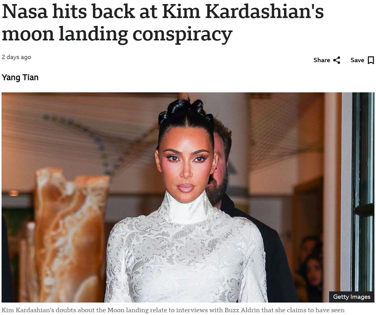 卡戴珊称美国登月造假,遭到NASA局长否认 美国真人秀明星金·卡戴珊 (Kim Kardashian) 在她最新的电视节目中发表了评论,告诉联合主演莎拉·保尔森,她认为登月“没有发生”,即 1969 年将第一个人送上月球的太空任务是伪造的。 卡戴珊向保尔森展示了对宇航员巴兹·奥尔德林的采访,巴兹·奥尔德林在阿波罗 11 号任务期间与尼尔·阿姆斯特朗一起迈出了月球表面的第一步。她阅读了据称奥尔德林在回答有关探险中最可怕时刻的问题时的一段话:“没有可怕的时刻,因为它没有发生。这可能会很可怕,但这并不是因为它没有发生。“然后卡戴珊告诉制片人,她认为登月是假的。她还说:““我认为这是假的。我在 Buzz Aldrin 上看过一些视频,谈论它是如何没有发生的。他现在在采访中经常这么说。也许我们应该找到巴兹·奥尔德林。“ 目前尚不清楚卡戴珊阅读的是哪篇文章,也不清楚这些引文是否真的来自奥尔德林。 节目播出后遭到美国宇航局代理局长肖恩·达菲 (Sean Duffy)的反对和否认,他 在社交媒体上写道。“是的,我们以前去过月球......6次!”,并宣传了美国宇航局目前的月球探索计划阿耳忒弥斯,该计划正在唐纳德·特朗普的“领导下回归”,“我们赢得了上一次太空竞赛,我们也会赢得这次竞赛。” 关于人类是否真的到达月球的阴谋论已经持续了 50 多年,特别是随着社交媒体的兴起。但几十年来,科学家和专家一直在反驳声称阿波罗 11 号任务是一场骗局的阴谋论。