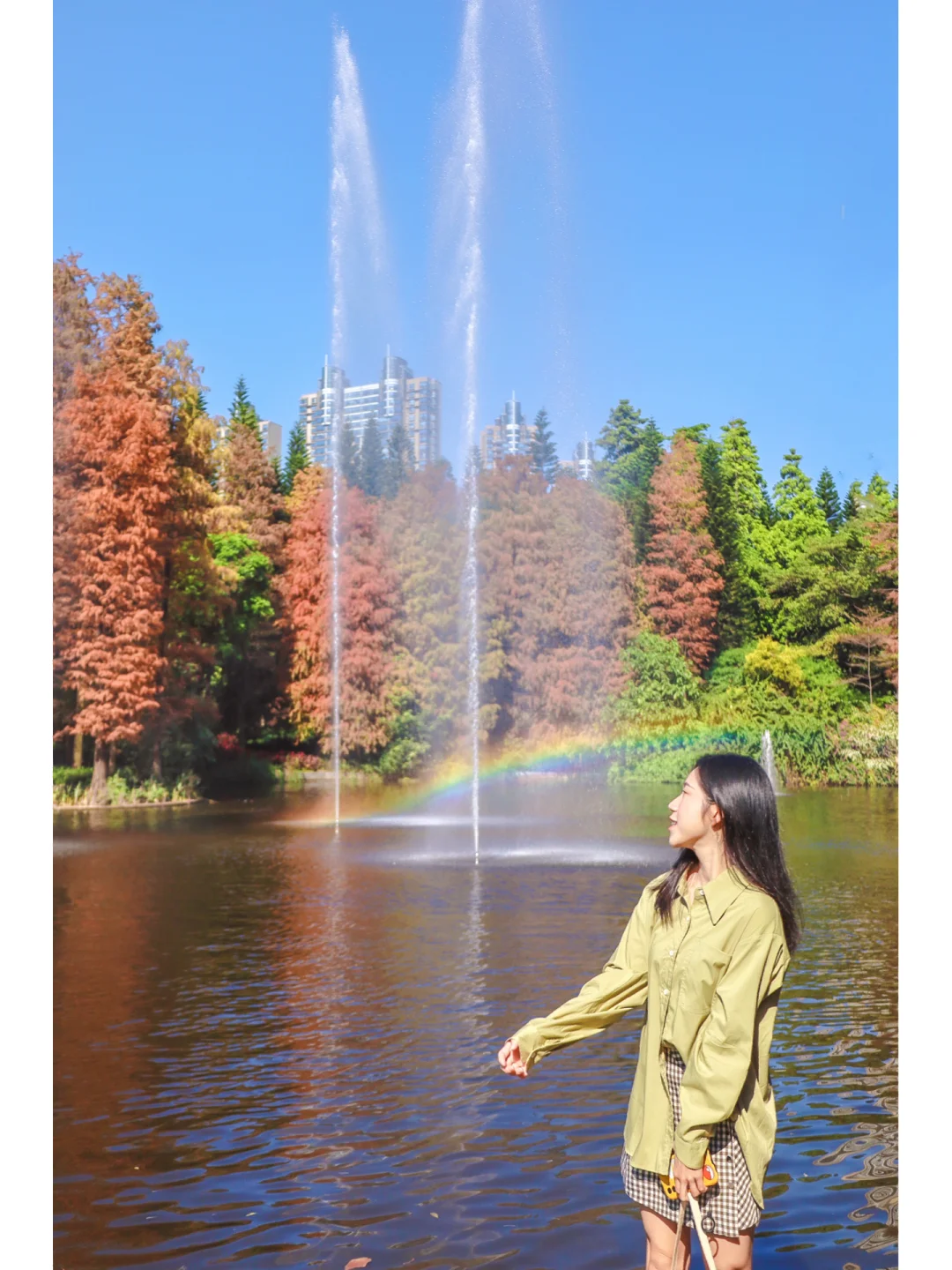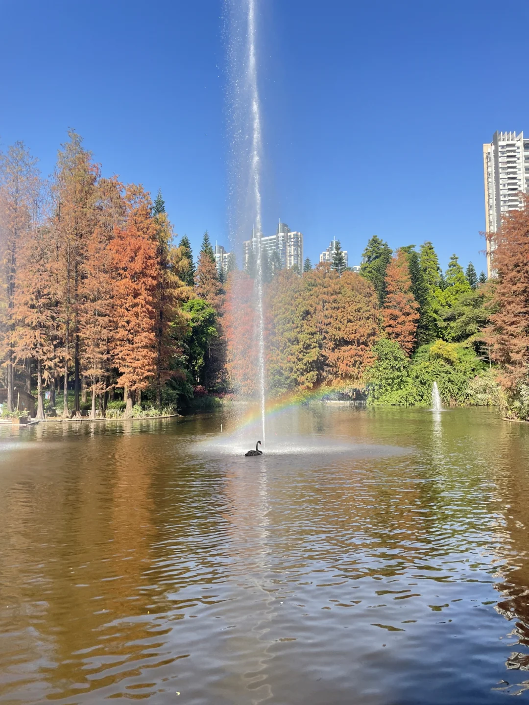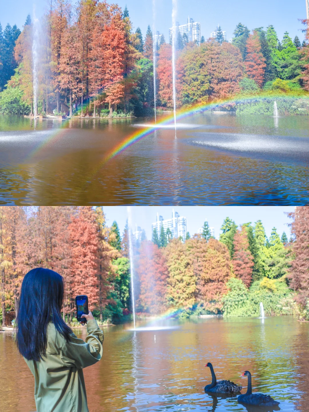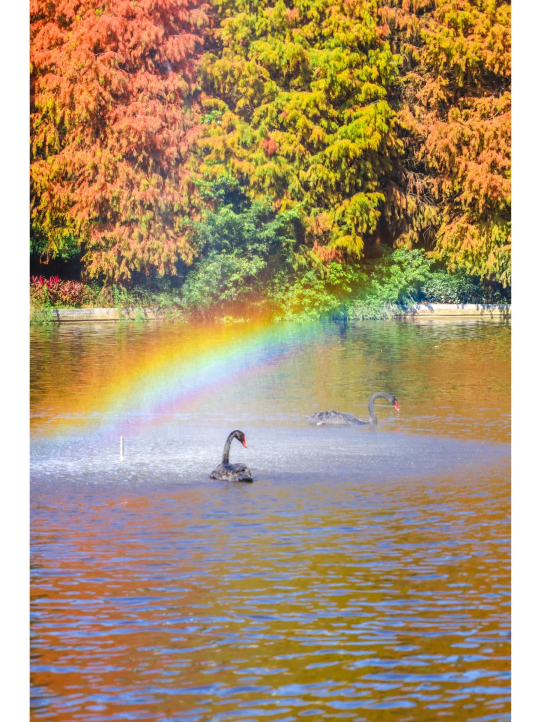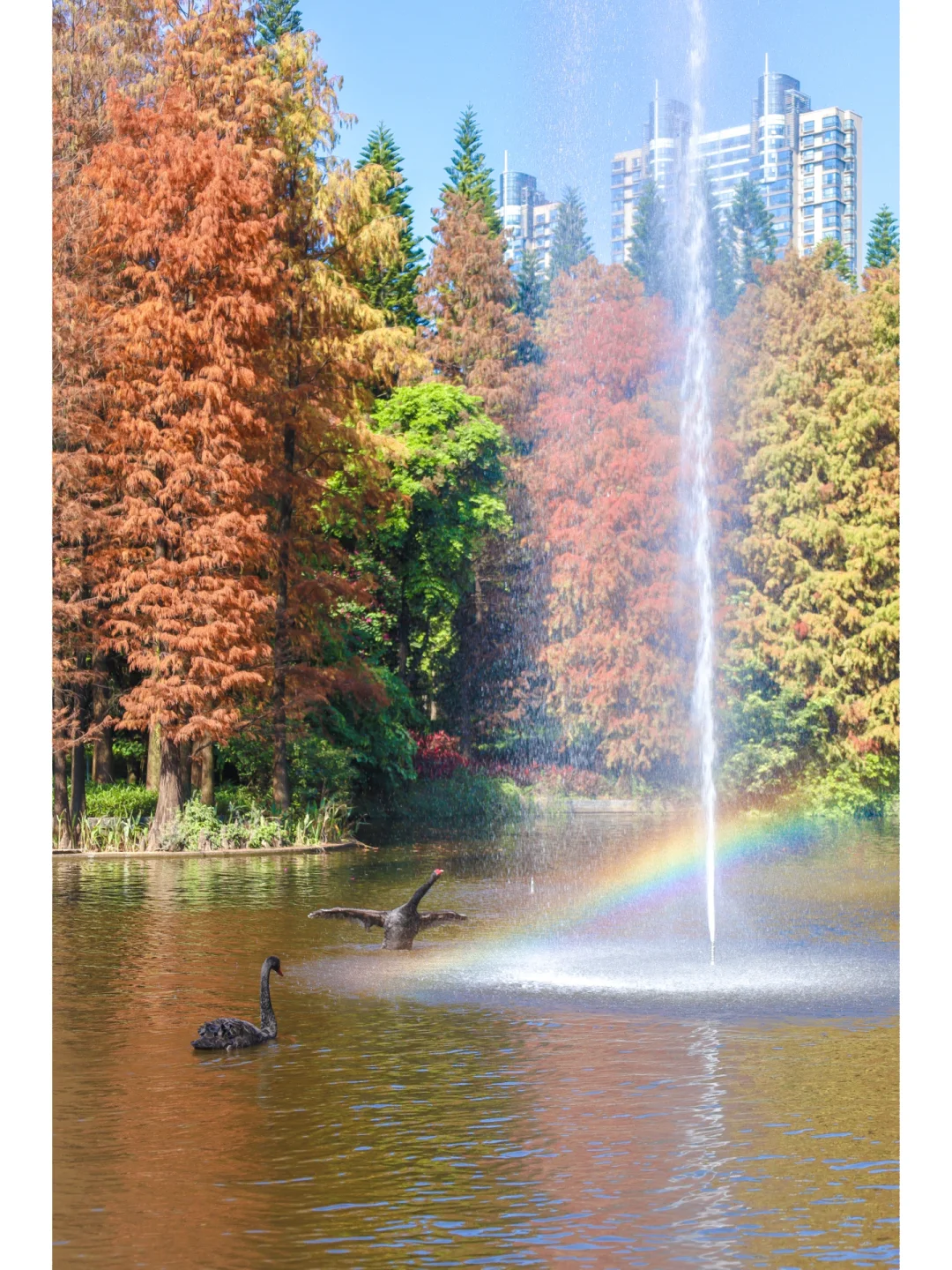 1⃣️喷泉、黑天鹅、落羽杉在园内的「快绿湖」,如果想拍到彩虹🌈一定要挑个有阳光的好天气过来,建议早上来拍。如果黄昏过来,可以拍到日落🌄