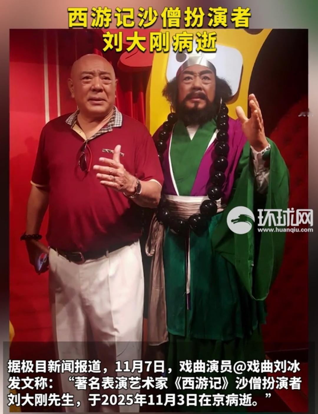 2025年11月3日,国家一级演员、1998版《西游记续集》沙僧扮演者刘大刚因病离世,享年78岁。对于很多80后、90后来说,他塑造的沙僧是童年里不可磨灭的经典。头戴僧箍、身挂佛珠、一袭蓝衣,还有那句“大师兄,师父被妖怪抓走了”,仿佛还在耳边回响。 当时筹备《西游记续集》,他临危受命接替闫怀礼演沙僧。为演好角色,他在道具担中塞砖头练负重打斗,被威亚勒得腰间青紫也坚持拍摄。此外,他还在《三国演义》《宰相刘罗锅》等数十部作品中有着精彩表现。刘大刚的离去,让一代人的童年记忆落幕。