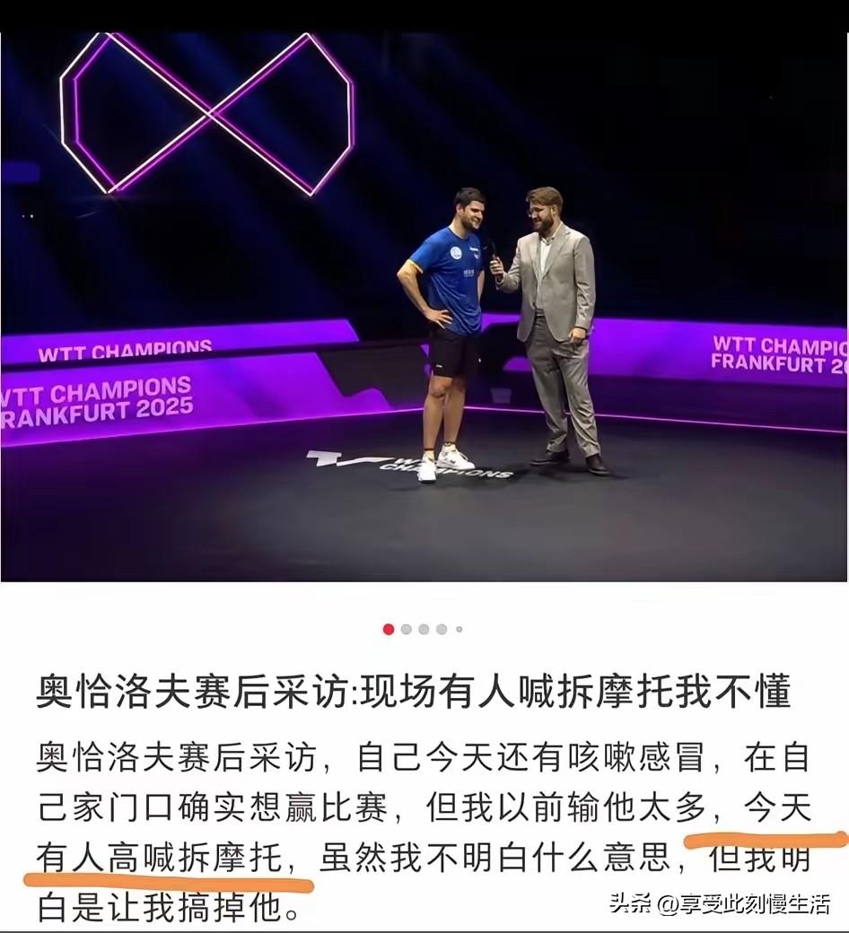 有人高喊拆摩托,虽然我不懂什么意思,但我明白是让我搞掉他。 哈哈!奥恰洛夫还是懂得幽默的。张本智和也真是的,连一个37岁又老又病的德国选手都没拿下来,还天天吼吼吼的嚣张。 我觉得他最近安静多了。以前他觉得自己只是打不过中国队,现在连外协人人都能挑战他了。他可能心里防线崩塌了。自信心跌倒谷底了。然后看到松岛辉空迅速崛起,感觉他压力山大,有点泄气了。