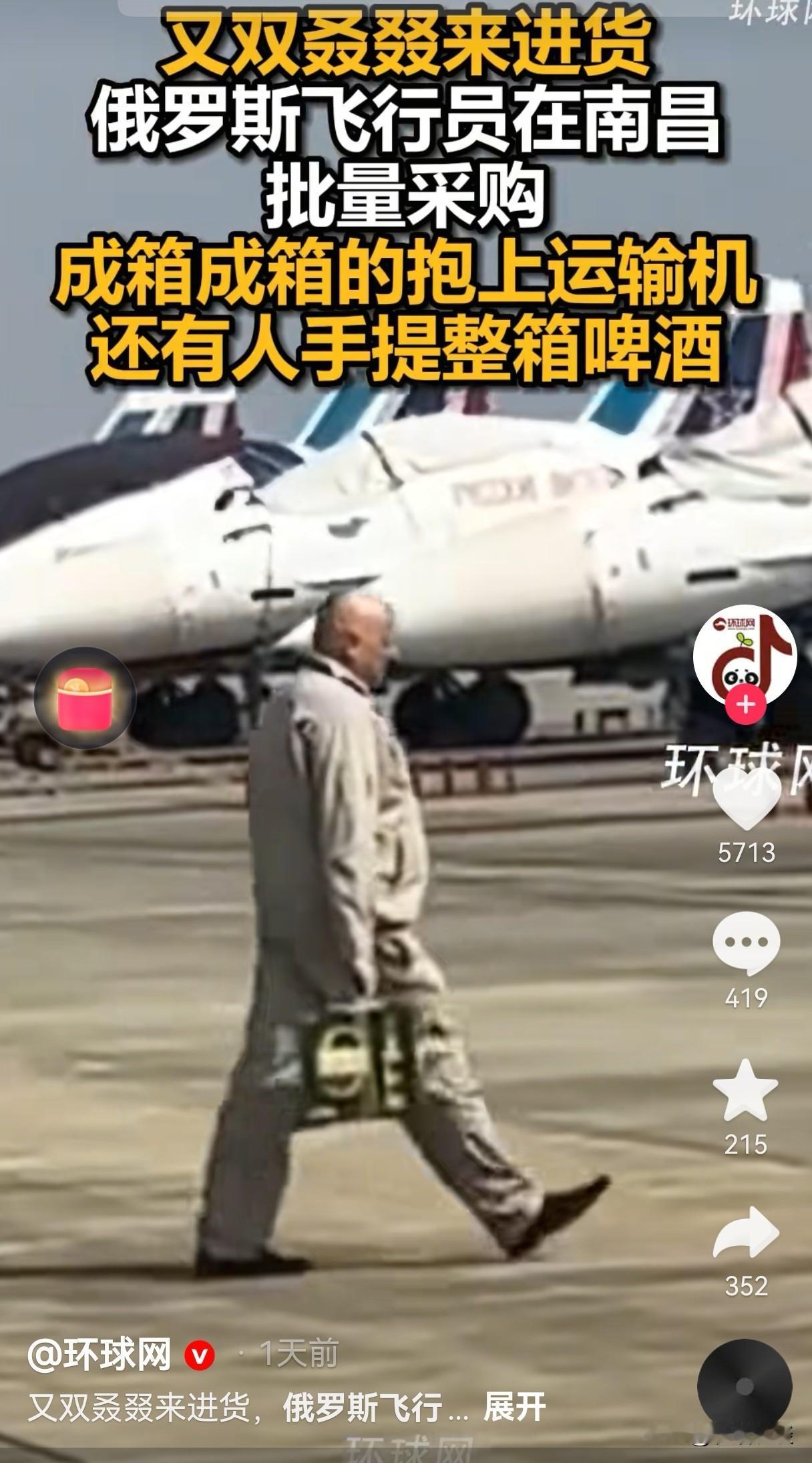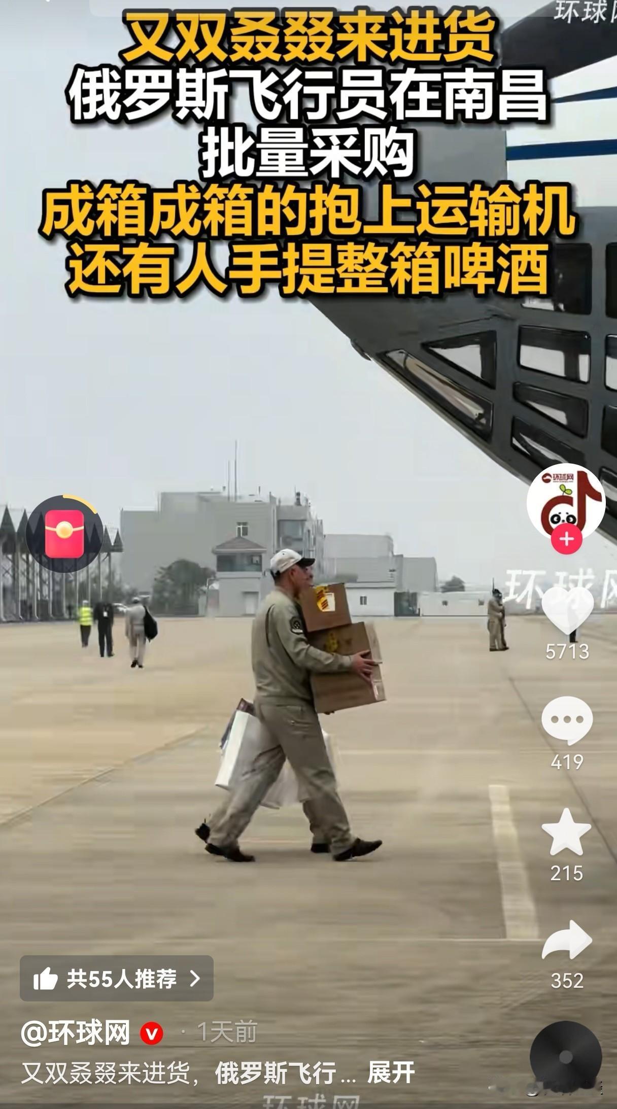 果然是战斗民族, 连扫货都别具一格,成箱成箱的啤酒往运输机上搬,多亏是专机,要不然限运呢。 更可爱的是这些身材魁梧的俄飞行员, 抱着咱家的东风-C5文创抱枕,那画风别提有多萌啦。 这可不是他们头一回扫货, 去年珠海航展刚一结束,就人手一箱青岛啤酒。 为啥这么爱中国货? 质量硬,价格香呗! 中国茶叶品质强,啤酒口感好还实惠, 加上中俄关系,来了就跟回家一样自在 。 抢着买军事文创品,这是对咱中国军工的认可。 这满机舱的货物哪里是商品,分明是两国越处越铁的见证! 这样的“双向奔赴”看着就暖心!