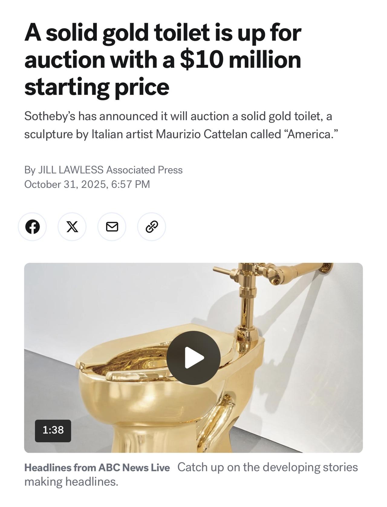 苏富比周五宣布,将于 11 月 18 日拍卖一件纯金马桶雕塑,该雕塑由意大利艺术家毛里齐奥·卡特兰Maurizio Cattelan创作,名为“美国”。 拍卖行称其为“对艺术生产和商品价值碰撞的尖锐评论”。它也是一个功能齐全的厕所,与2019年在英国布伦海姆宫的一次大胆抢劫中被盗时获得全球声誉的厕所相同。 11月18日在纽约拍卖会的起始价格将是用于制造它的101.2公斤(223磅)的黄金的起始价格——目前约为1000万美元。 纽约苏富比当代艺术主管David Galperin表示,卡特兰Cattelan是“完美的艺术界挑衅者”。 他也是最成功的艺术家之一,他的作品《喜剧演员》是一根用管道贴在墙上的香蕉,去年在纽约拍卖会上以620万美元的价格售出。“他”——卡特兰跪着的阿道夫·希特勒的令人不安的雕塑——在2016年的佳士得拍卖会上以1720万美元的价格售出。 这位艺术家说,“美国”讽刺了过度的财富。 他曾经说过:“无论你吃什么,200美元的午餐或2美元的热狗,结果都是一样的,就厕所而言。” 2016年创建了“美国”的两个版本。自2017年以来,正在出售的那个一直由一个匿名收藏家拥有。 另一个版本于2016年在纽约古根海姆博物馆的浴室展出。超过10万名游客排队——轻而易地说——与工作互动。 古根海姆将这项工作提供给了美国。唐纳德·特朗普总统在上任的第一个任期内,请求借用一幅梵高的画作。 2019年,它在布伦海姆宫展出,布伦海姆宫是温斯顿·丘吉尔的出生地,是英国乡村庄园。几天之内,它被窃贼偷走了,他们闯入大楼,强行把它从管道上抢走,然后逃跑了。 今年早些时候,两名男子被定罪并入狱。厕所从未恢复过。调查人员认为它可能被拆散并融化了。 Galperin不愿意猜测“美国”能卖多少钱。他指出,卡特兰的管式香蕉提出了一个问题,即“人们如何为本质上除了作者身份和概念之外没有价值的东西分配价值。 “'美国'在许多方面与之完全相反。这是一个完美的衬托,因为它的作品具有许多内在价值,而大多数艺术品都没有,”他说,“原材料和艺术理念之间的价值比例问题在这里非常摆在桌面上。” 从11月8日到拍卖会,“美国”将在苏富比纽约新总部布劳尔大厦展出。它将放在浴室里,游客将能够近距离和亲自看到它。 在古根海姆和布伦海姆宫,厕所与管道系统相连,游客可以预约3分钟使用。这一次,游客将能够使用它——他们可以看,但不能冲洗。