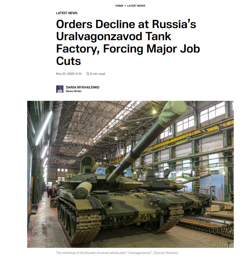 俄罗斯钢铁洪流彻底不灵了? 俄罗斯最大的坦克制造商乌拉尔车辆厂正在裁员约10%,并于2月份冻结所有新员工招聘。 内部消息称,部分部门的员工裁减幅度可能高达50%,这表明军工订单或国家拨款大幅下降。 俄罗斯现在的处境确实挺惨的,石油设施持续遭到乌克兰打击,前线也是节节败退,这么打下去老底也扛不住啊。