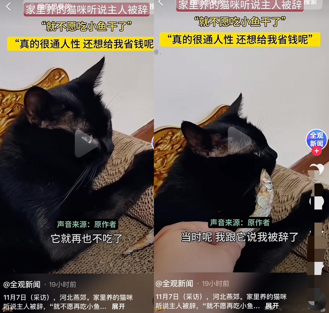 万物有灵!河北燕郊,男子被辞退了,回家后心情不好就跟家里的小猫抱怨念叨了几句,没想到小猫听到后以前爱吃的小鱼干就再也没吃了。 男子随口抱怨几句烦心事,小猫竟默默记在心里。往日围着转的小鱼干失宠,反而陪着主人啃馒头。它哪晓得失业压力,只知道主人不开心,就用不吃“美味”的方式,陪主人一起省钱。 比起有些人的虚情假意,动物的爱简单又纯粹。它们不会甜言蜜语,也不懂权衡利弊,仅凭本能将偏爱藏在细节。你难过,它静静陪伴;你拮据,它主动“将就”,这份真挚,有时比人情还暖心。 养宠物,不就图这份纯粹的陪伴嘛。你家宠物有没有啥举动,让你瞬间感动呢!职场辞退