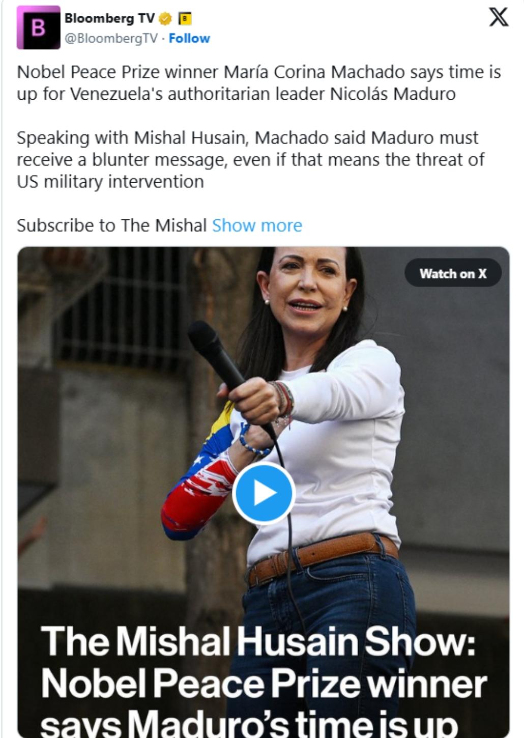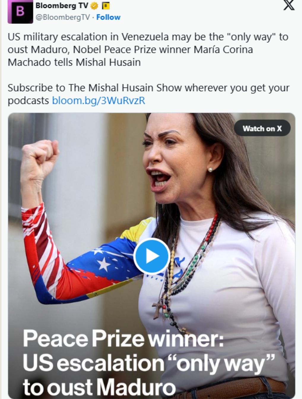 天大的讽刺:刚拿诺贝尔和平奖就呼吁特朗普对自己国家用兵? 58岁的委内瑞拉反对派领袖马查多是2025年诺贝尔和平奖得主,近日接受专访时表示支持特朗普政府近期在加勒比海对疑似毒运船只的攻击,并将因美方空袭所造成的死亡责任归咎于委内瑞拉总统马杜罗(Nicolás Maduro),并且喊话特朗普赶快对委内瑞拉用兵。 马查多表示,对委内瑞拉采取军事行动,是让马杜罗下台的唯一途径。她说:“加大压力与升级行动,才可能让马杜罗明白该走的时刻到了,并促成和平、有序的政权过渡。” 然而,特朗普近来在加勒比海与东太平洋对多艘疑似「毒犯」船只发动攻击,造成数十人死亡的行动一直遭受民主、共和两党内对这些攻击的合法性的质疑,参议院民主党人认为这些做法可能违法,包括可能违反禁止暗杀的相关法律。