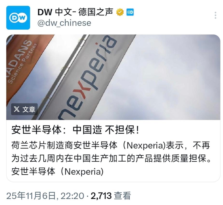 德国之声11月6日晚报道:“荷兰芯片制造商安世半导体表示,不再为过去几周内在中国生产加工的产品提供质量担保。 安世半导体荷兰方面周四(11月6日)宣布,不能再保证在10月13日之后在中国进行进一步加工的半导体是正品,并且符合质量要求。同时,安世半导体表示对解决这场危机持乐观态度。” 荷兰方面这波操作真是让人看得一头雾水,好好的突然就说不担保中国加工的产品质量了,这声明发得未免太突兀。说句实在的,这担保当真是可有可无,中国这边早就不用靠外人来给产品质量背书了。 先掰扯清楚一个事儿,安世半导体哪儿是什么纯粹的荷兰企业啊,2018 年就被中国的闻泰科技花 36 亿美元买下了,说白了这就是家中国控股的公司。 这些年靠着中国市场的拓展和产能提升,安世的生意做得风生水起,2018 年销售额就突破了 10 亿美元,欧洲 40% 的车用芯片市场都被它占着,这成绩难道是靠荷兰的质量担保堆出来的?显然不是,是中国这边的生产管理和品控能力实打实拼出来的。 荷兰方面倒是挺会给自己找台阶下,一边宣布不担保,一边又说对解决危机持乐观态度。可到底是什么危机?明眼人都清楚,这事儿跟荷兰政府 9 月底突然接管安世脱不了干系。 当时荷兰政府拿 “国家安全” 当借口,说发现了 “严重管理问题”,硬生生把一家中国控股的企业攥到自己手里,结果呢?接管之后供应链立马就出问题了。 10 月 26 日荷兰方面干脆停止给中国的安世工厂供应晶圆,导致生产都没法正常进行,现在倒好,反过来怪中国加工的产品质量没法保证,这逻辑简直让人笑出声。 中国商务部早就把话说透了,责任全在荷方。中方一直想着维护供应链稳定,11 月 1 日还宣布对符合条件的出口予以豁免,努力帮着恢复供货,可荷兰那边根本不接茬,一门心思要搞事情。 现在倒好,自己把供应链搅得一团乱,还反过来甩锅说产品质量有问题,这操作实在是不地道。 再说了,中国现在的半导体加工能力早就今非昔比了。别说是安世这种消费级和车用芯片,就算是更复杂的成熟制程芯片,咱们也能稳稳拿捏。 2025 年成熟制程的自给率都已经到 60% 了,28nm 及以上制程的全球产能占比快到 40%,车规级芯片的良率稳定在 92% 以上,这些数据可不是吹出来的。 半导体设备的国产化率也在往上走,整体都到 45% 了,刻蚀机、薄膜沉积设备更是超过 60%,清洗设备都奔着 70% 去了,这么完善的产业链,还需要别人来担保质量? 安世中国的工厂运营这么多年,客户早就对产品质量心里有数。汽车智能化大潮下,每辆车要用的芯片数量翻了好几倍,燃油车要 600 枚,电动车更是多达 1600 枚,要是中国加工的芯片质量真有问题,欧洲车企能那么依赖吗? 早就换供应商了。现在荷兰方面突然跳出来说不担保,说白了就是想通过这种方式施压,可这招根本不管用。 更有意思的是,安世荷兰总部之前还发声明说,依然致力于在中国的业务发展,会和中国的员工、客户站在一起。 这话刚说完没几天,就来了个 180 度大转弯,说不担保质量了,这前后矛盾的态度,实在让人摸不透到底想干什么。 要么就是内部没协调好,要么就是故意搞双重标准,想一边占着中国市场的好处,一边又拿质量说事拿捏人。 可他们忘了,现在的中国半导体产业早就不是任人拿捏的样子了。就算没有荷兰方面的所谓 “担保”,安世中国照样能给客户提供靠谱的产品。 这些年西方搞技术封锁,反倒逼着中国把产业链建得更扎实,从设计到制造再到封测,全链条都在协同发力,大基金三期投了几千亿支持研发,就是为了把主动权握在自己手里。 现在看来,这步棋走得太对了,不然还真得被荷兰方面这波无理操作卡脖子。 荷兰方面要是真为了解决危机,就该拿出点实际行动来,别光嘴上说乐观,背地里干着搅乱供应链的事。 停止供应晶圆、宣布不担保质量,这些做法除了让全球半导体产业更紧张,没有任何好处。 欧洲的车企已经开始喊芯片不够用了,再这么折腾下去,最后受损的还是他们自己的利益。 说到底,中国这边的产品质量好不好,客户说了算,不是荷兰方面一张声明就能否定的。 安世中国有自己的品控体系,有成熟的生产流程,还有整个中国半导体产业链做后盾,根本不用靠外人的担保来证明自己。 荷兰方面与其花心思发这种没用的声明,不如赶紧解决实际问题,别再拿质量当借口搞事情了。真要是把中国市场惹急了,最后吃亏的只会是他们自己。 参考文章:菲常视野陈菲 11.06 德国之声今晚(11月6日晚)报道:“荷兰芯片制造商安世半导体表示,不再为过去几周内在中国生产加工的产品提供质量担保。