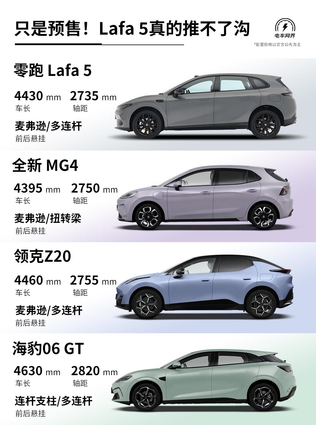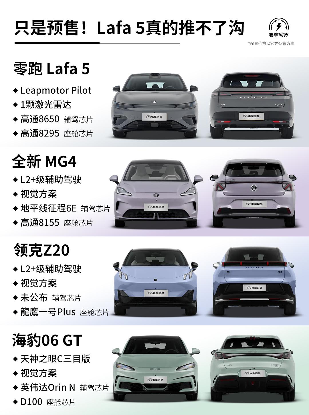 昨晚零跑Lafa5正式预售,价格10.58-13.18万元,具体版本配置可以看我之前发的配置图。 简单来说就是除了最低配外,Lafa5 基本可以分为 515km和605km 带激光雷达智驾版和非智驾版。 动力上除了最低配外,全部218匹马力的后驱单电机,零百加速6.4秒。 在配置上,全系19寸“鸳鸯胎”大轮毂、14.6英寸的中控大屏保证了外观和内饰一眼看起来够酷,另外全景天幕+遮阳帘、方向盘加热、电动后尾门、50W无线充、前排座椅电动调节、座椅加热通风、12扬声器音响、256色氛围灯、外后视镜加热折叠、雨量感应雨刷等配置全部都有(最低配除外)。 所以零跑Lafa 5的配置在同级中还是非常不错的,不至于推沟里。而且现在只是预售价,相信上市后还会有不小的让幅,你觉得呢?【来自懂车帝车友圈】