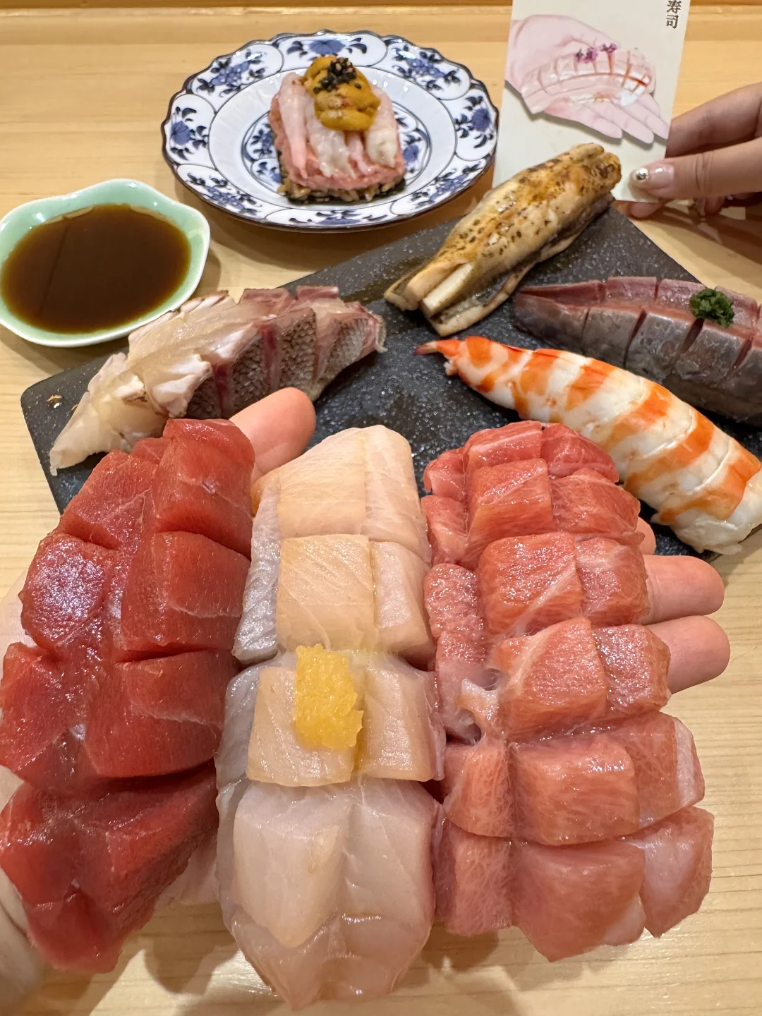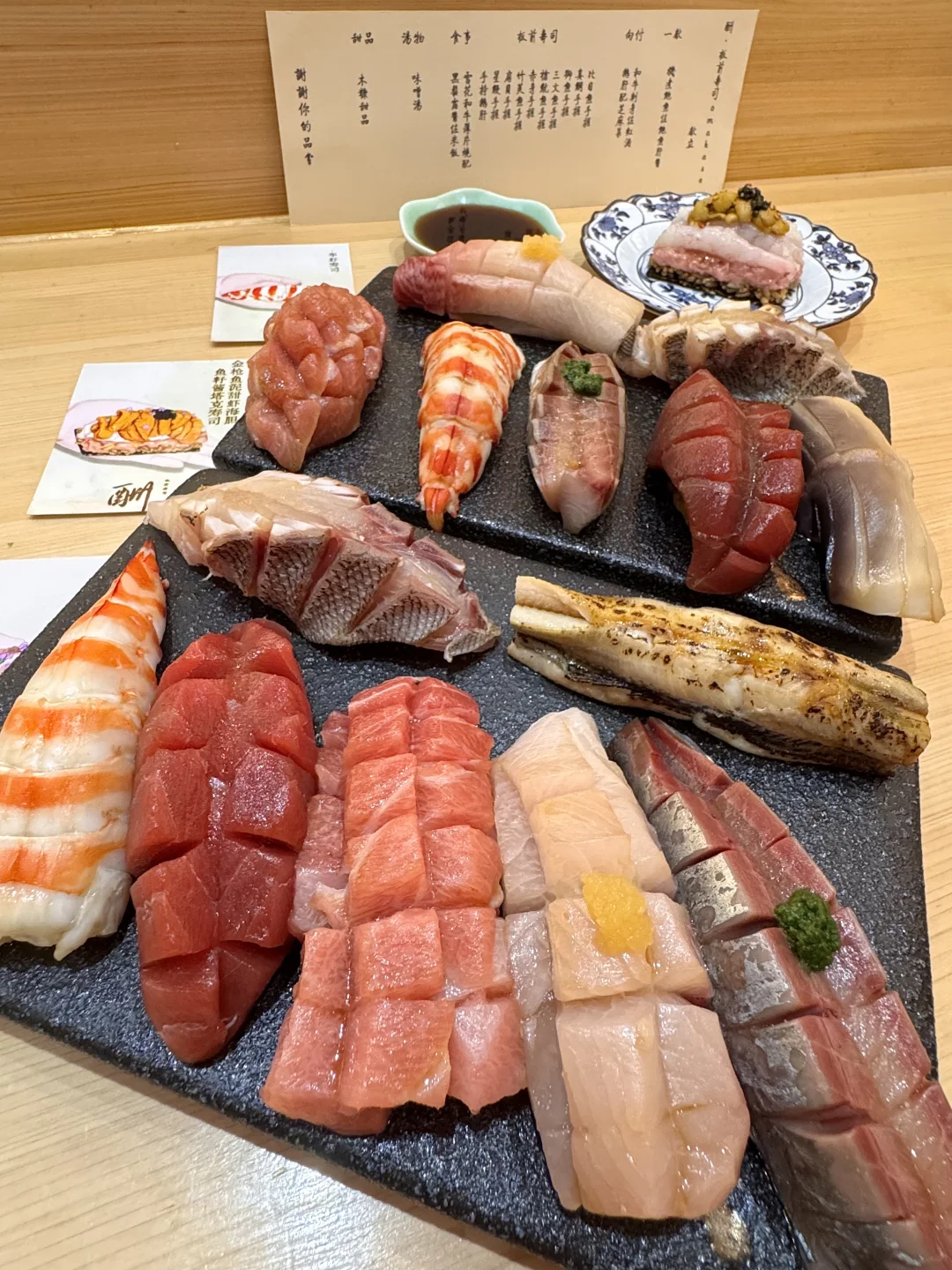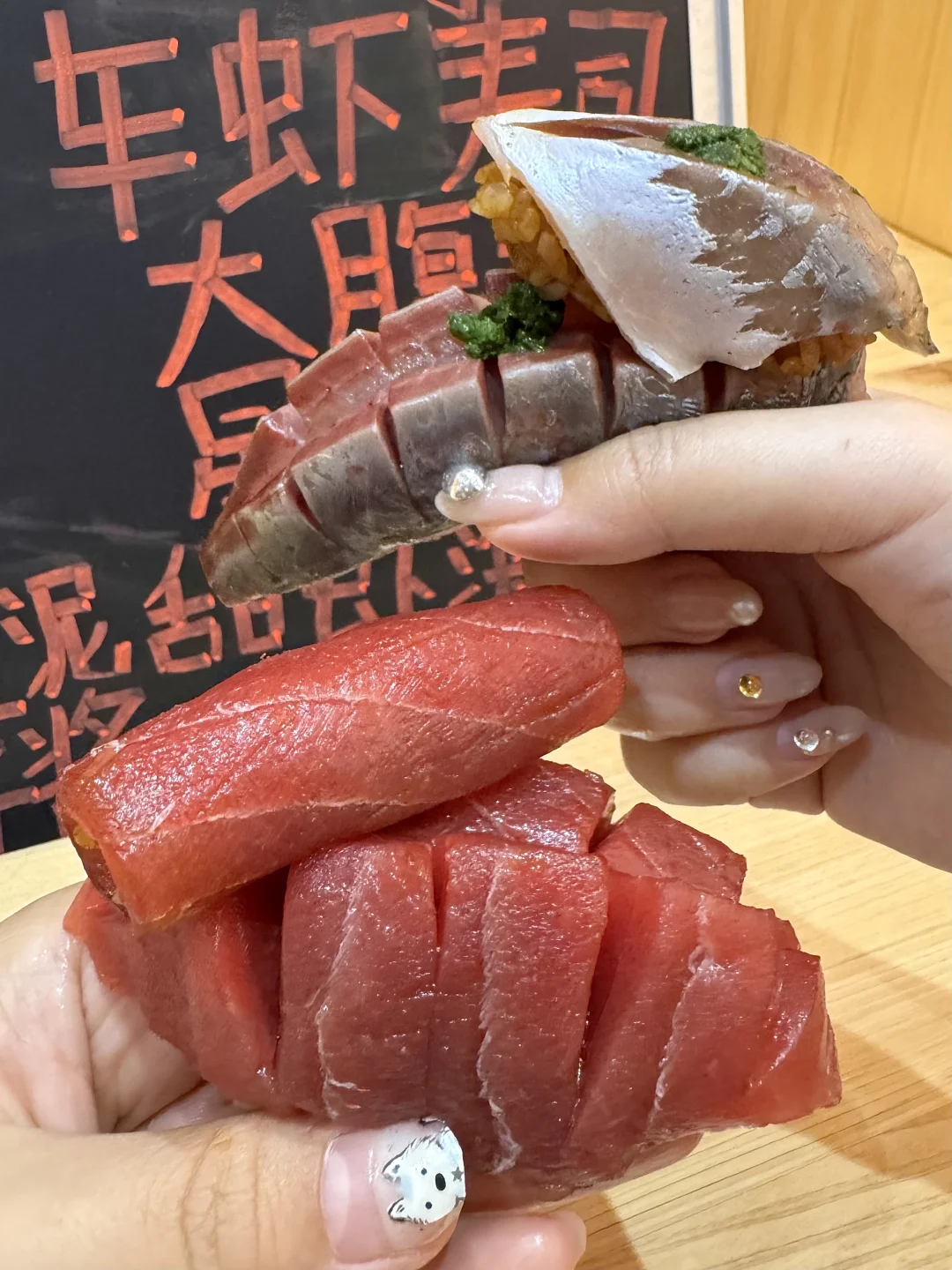 XXXL号巨型寿司!一个顶我拳头大!就在国大广场,叫:酬寿司)师傅现捏现做,一口料巨足!车虾、小竹荚、星鳗、赤贝…一吃一个不吱声!!好适合和朋友一起来一二人食!