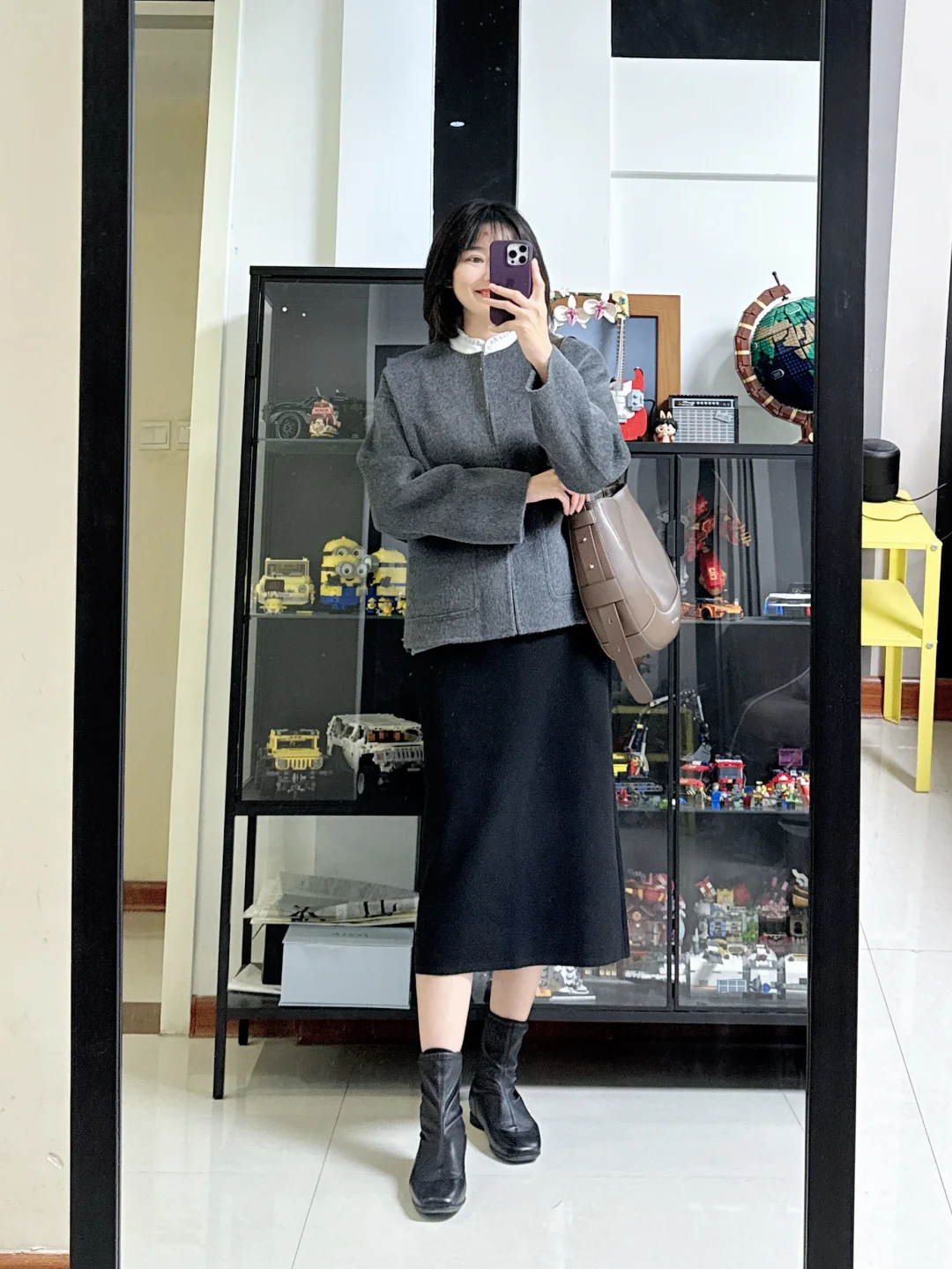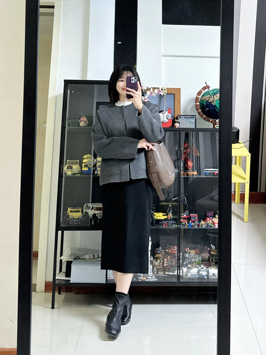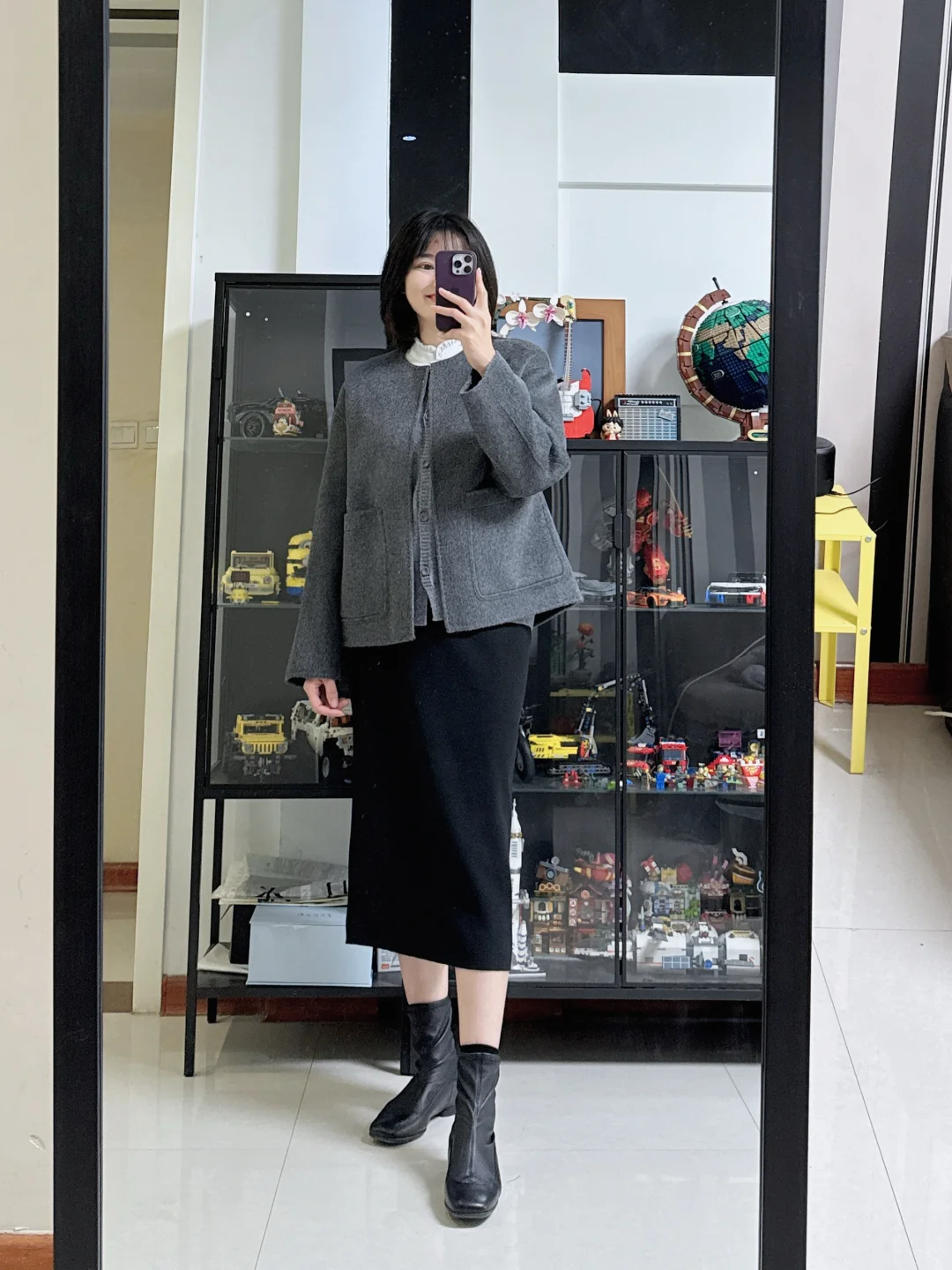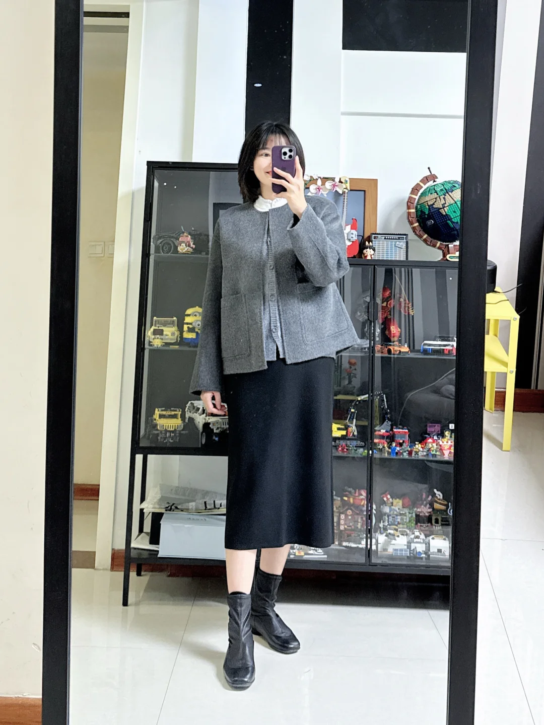 👩灰色短款大衣搭配黑色直筒裙,简单利落,里面内搭可以穿件立领白色衬衫,让整套妆造多一点点活力感。