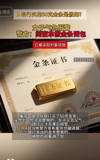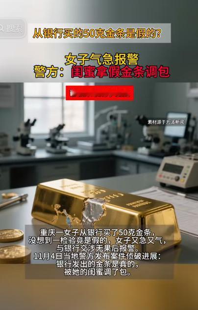 重庆,一女子在银行买了几根金条,看金价上涨,就拿了一根去银行兑换,没想到,工作人员查看后却告知这是假的,女子质疑:金条是我在你们银行买的,你现在告诉我是假的?随即选择报警,警方介入后发现银行的金条是真的,问题出在了女子的闺蜜身上,网友:防火防盗防闺蜜! 重庆的孙女士最近差点被气哭,她之前在银行买的黄金,如今想变现时竟被工作人员说 “是假的”。 事情的起因是在前一段时间孙女士看着金价涨了不少,于是她就揣着金条走进银行,递过去的时候还挺开心,琢磨着能赚一笔。 可工作人员拿着金条反复查看,脸色越来越严肃,最后跟她说,“您这金条有问题,可能是假货。” 孙女士当场就愣了,嗓门都提高了,这是我之前在你们银行买的, 周围的人都看了过来,她又急又气,好好的投资怎么就成了 “假货风波”。 孙女士觉得很不对劲于是立马就选择了报警,随后警察很快赶来,把金条拿去做了专业鉴定。 后来鉴定结果出来,孙女士悬着的心先放了一半,说她当时购买的金条是真的,但这次拿来的却是假的。 面对这样的结果孙女士很是震惊,随后等警方接着调查,这一查,查出了让孙女士更生气的事,问题出在她闺蜜身上。 原来闺蜜趁孙女士不注意,偷偷把金条的一部分给换了,想从中捞点小利益,就因为这,金条的重量和成色出现了偏差,才让银行工作人员起了疑心。 那一刻孙女士怎么也没想到,闺蜜会干出这种事,当初买金条只是想找个稳妥的投资方式,没成想没栽在市场上,倒栽在了身边人手里。 事后这件事情被网友们看到了之后,一些网友在下面说,作为身边的最信任的背叛,是一件很令人生气的事情,此外还有一些网友在替孙女士委屈,也对这种破坏信任的行为很不齿。 最后虽然误会解开,金条也没问题,但孙女士心里落下了疙瘩,真金不怕火炼,可人心有时候比金子还难测。 那么通过这件事给了她和所有人一个警示,无论多亲近的人,也可能在不经意间影响你的财产安全。 保护自己,不仅要看紧金钱,更要在信任上保持清醒,防火、防盗、防闺蜜,不只是调侃,而是现实生活中不可忽视的提醒。 对此,你还有什么看法呢? (信息来源 :国际珠宝网 )