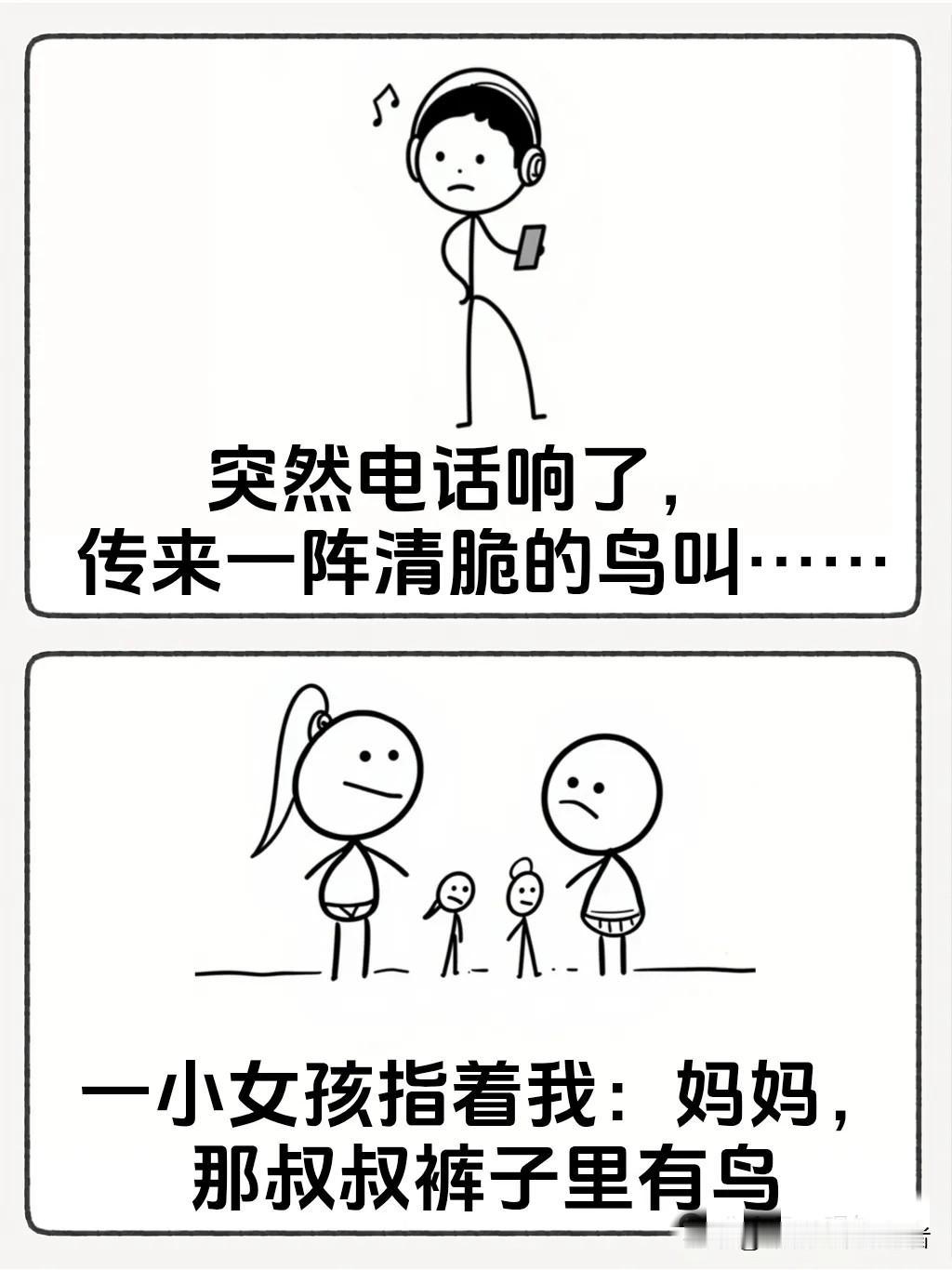 趣味漫画:“手机铃声是鸟叫声,今天坐公交,把手机放裤兜里突然电话响了,传来一阵清脆的鸟叫…一小女孩指着我:妈妈,那叔叔裤子里有鸟…”