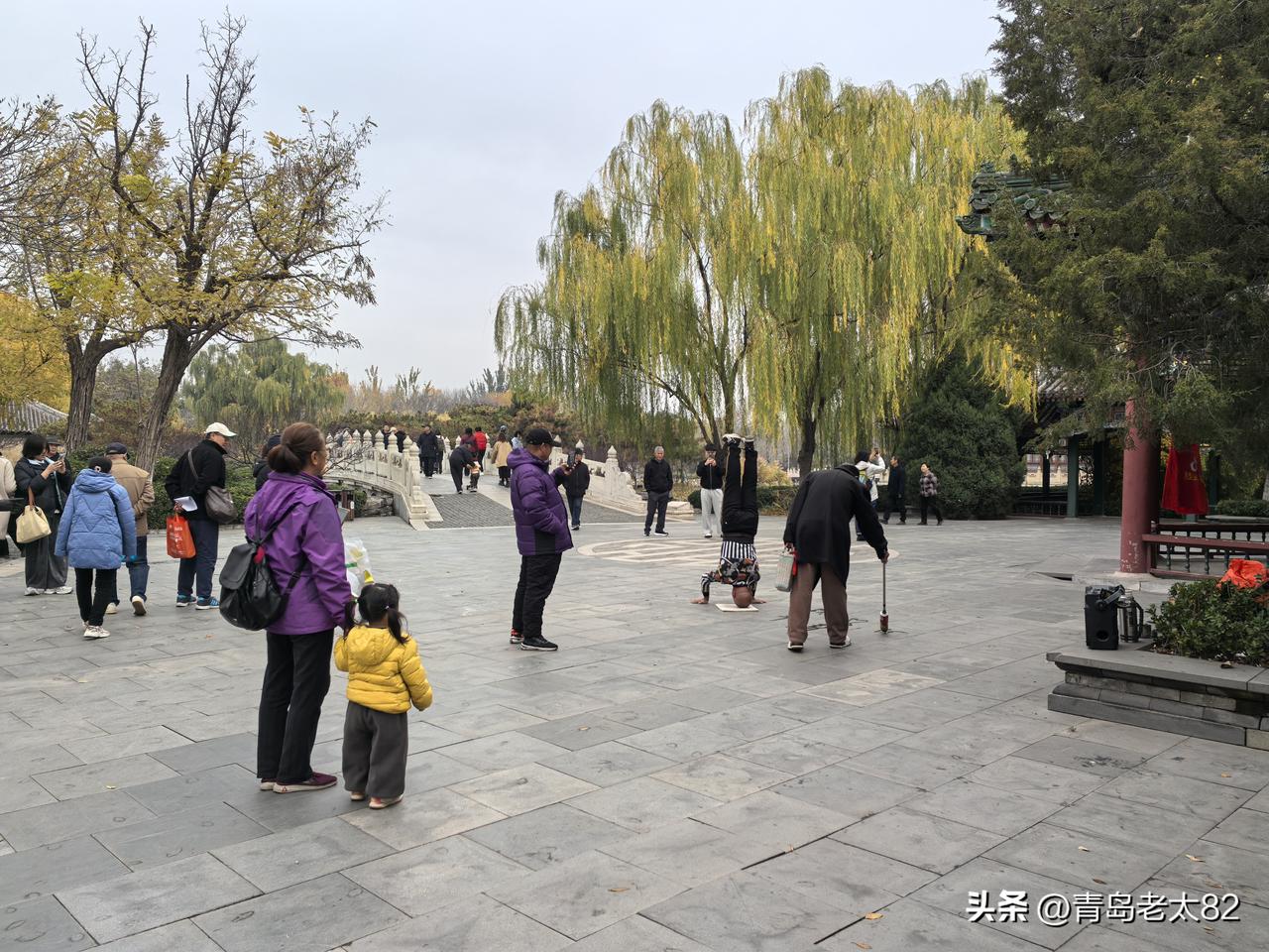 今天漫步在天津北宁公园,这里秋色正浓,拱桥湖泊,芦苇荷叶,各种树木的树叶五彩缤纷,五颜六色,煞是好看:深绿,浅绿,深黄,浅黄,深红,浅红… 脚踩在厚厚的落叶上,好像走在柔软的地毯上,特别舒服。树上的落叶纷纷扬扬地落下来,像彩色的蝴蝶在我身边翩翩飞舞。偶尔看到几个拿着大毛笔的老人在地上挥毫泼墨。笔走龙蛇:或写“寿比南山不老松,福如东海长流水…”或写:天高云淡,望断南飞雁,不到长城非好汉…一个赛似一个,堪比民间的书法家。 今日天津北宁公园一就是我身边最好的秋色。