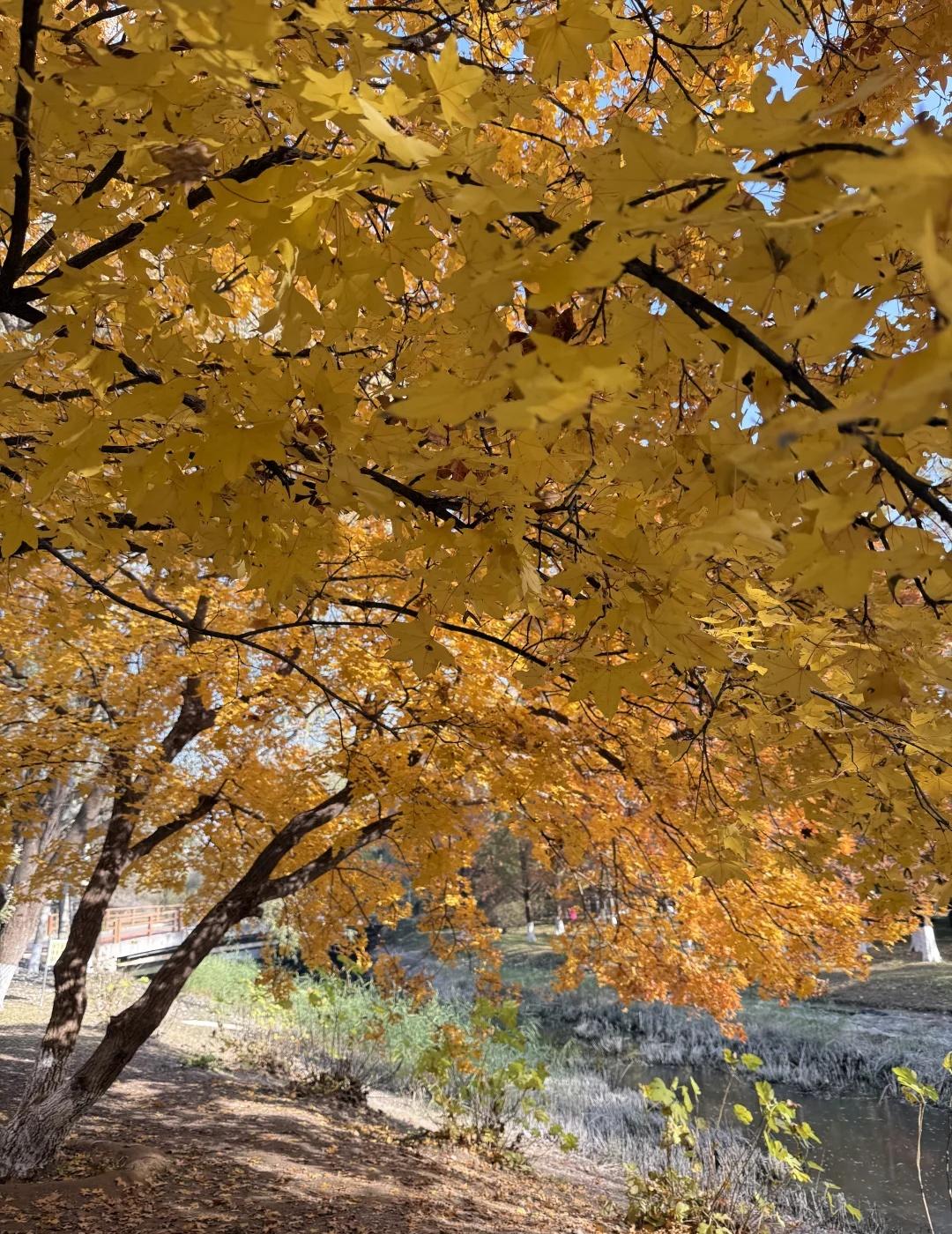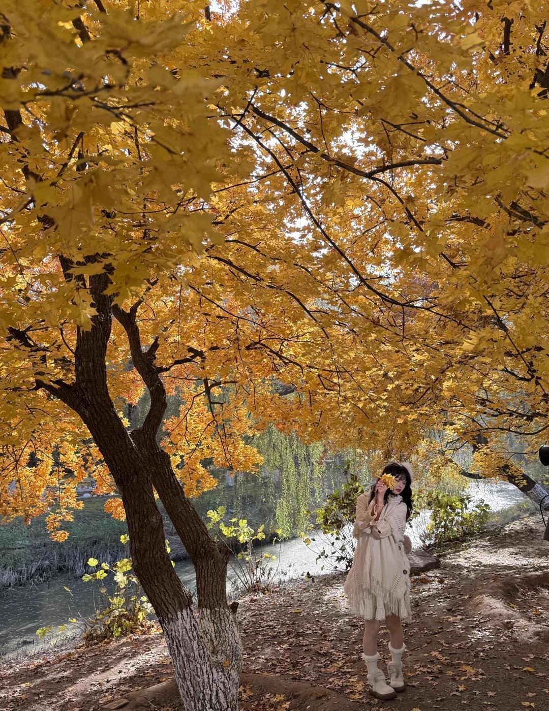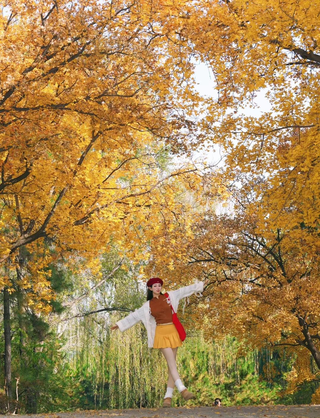 11.1奥森北园简直五步就一神树!附位置+路线 别去挤龙潭湖公园啦 奥森北园这里小众无人 而且几乎每隔几米就一颗巨型神树 枫叶金灿灿正是巅峰期 有几颗还邻水仿佛一副油画! 图9-16都是今日实拍live!原图直出! 【神树位置和路线】 直接定位奥森北园北17门进入 路线从1-4挨个走即可 1.楼兰姑娘附近(图1图9图10图11) 17门进门后往左边走5分钟左右 会看到一个巨大楼兰姑娘雕像 楼兰姑娘东南侧岔路口会看到一片金灿灿 这里算是最热门最出片的位置 因为在路边人也相对较多 枫树颜色金灿灿旁边还有条河 整个画面好像一幅油画 2.小坡附近的枫树 经过第一个点位向前走然后右转 会看到一片小山坡 山坡脚下有一颗超大的神树(图8、图12) 山坡上是一大片灿烂的黄色枫树(图4) 3.无人的湖边枫叶秘境(图3、图6、图14) 这个地方比较难找 上坡之后左拐会看到一大片草坪 草坪右侧被竹子墙拦住一半 竹子后面就是湖边的枫叶秘境 这里面湖水和建筑都特别美 枫叶有点枯了落叶很多 但还是很出片 4.大草坪左边4颗巨型枫树(图2图5图7) 这四颗比前面点位1的要更金红一点 有一颗枫叶低垂到人的腰部 我去的时候基本没人 旁边还有大雁和天鹅随意散步 这里真的好chill 浪漫生活记录者 北京秋天 北京拍照北平之秋北京旅游北京旅行攻略北京秋天旅游攻咯 奥森秋天 奥林匹克森林公园奥森枫树
